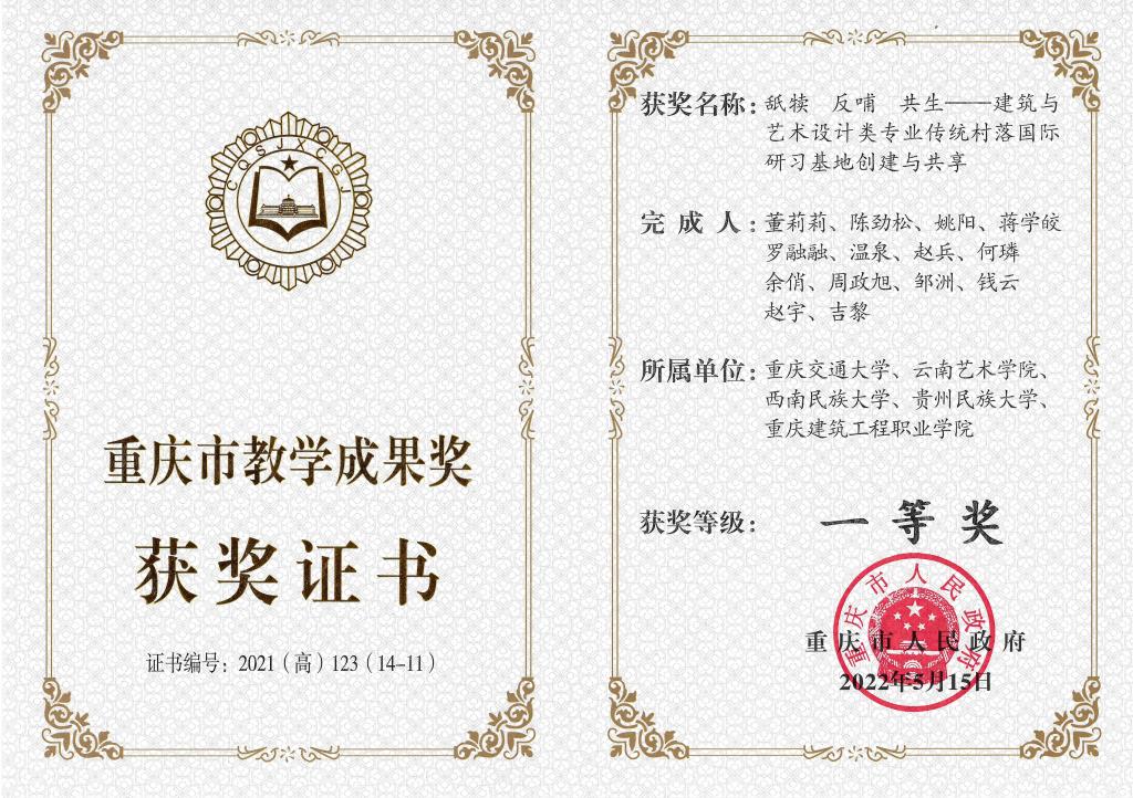 近年来,william威廉英国官网副院长陈劲松教授和william威廉英国官网设计学院环境设计系主任邹洲教授协同重庆交通大学等四所西部院校共同开展西南地区传统村落保育与活化的教学共建活动,负责并组织了多次国内外有关传统村落保护与发展的调研及联合教学活动,以实际问题为导向,激发学生解决问题的创新思维能力,多次为政府相关部门人员进行乡村振兴主题培训。经过多年的实践改革形成的教学成果《舐犊 反哺 共生——建筑与艺术设计类专业传统村落国际研习基地创建与共享》获得2022年重庆市人民政府颁发的“重庆市教学成果奖一等奖”。