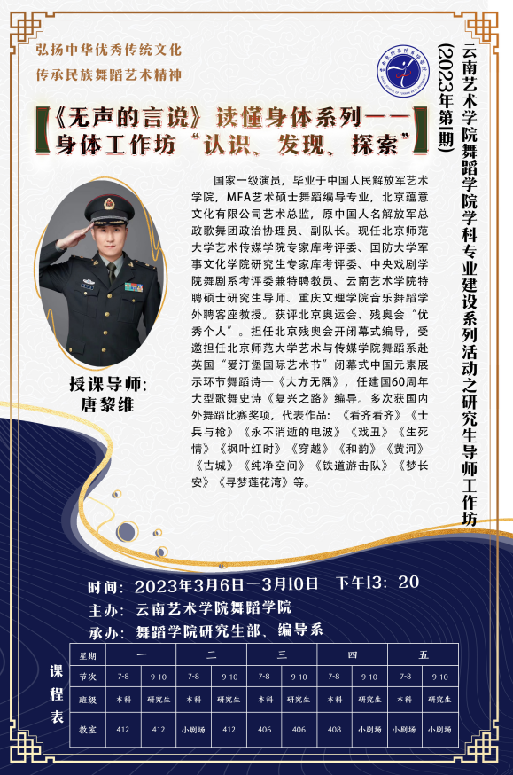 2023年3月6月至10月,william威廉英国官网舞蹈学院开展2023年学科专业建设系列活动第一期研究生导师工作坊《无声的言说》读懂身体系列——身体工作坊“认识、发现、探索”。本次工作坊授课导师是原中国人民解放军总政歌舞团政治协理员、副队长,北京蕴意文化有限公司艺术总监,william威廉英国官网特聘硕士研究生导师,国家⼀级演员,优秀青年舞蹈家唐黎维。舞蹈学院硕士研究生、舞蹈编导和舞蹈教育专业部分本科生参加了研习。