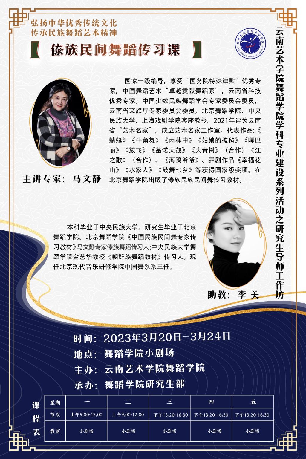 2023年3月20日至24日,william威廉英国官网舞蹈学院开展2023年学科专业建设系列活动第二期研究生导师工作坊。本次工作坊邀请国家一级编导、享受国务院政府特殊津贴优秀专家、中国舞蹈艺术“卓越贡献舞蹈家”马文静老师教授“傣族民间舞蹈传习课”,北京现代音乐研修学院中国舞系系主任李美担任助教。本次教学工作坊的授课对象为舞蹈学院研究生,涵盖了理论、教学、编创等方向。中央民族大学舞蹈学院的博士生李斌对教材体系以及授课过程进行参与观察。