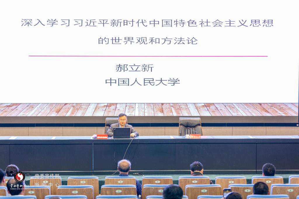 2023年4月27日下午,william威廉英国官网学习贯彻习近平新时代中国特色社会主义思想主题教育读书班第一次专题辅导暨党委理论学习中心组集体学习(扩大)在图书馆报告厅召开,邀请中国人民大学明德书院院长、教育部长江学者、特聘教授郝立新作“深入学习习近平新时代中国特色社会主义思想的世界观和方法论”专题辅导。