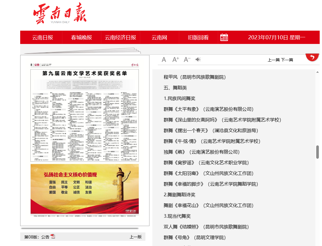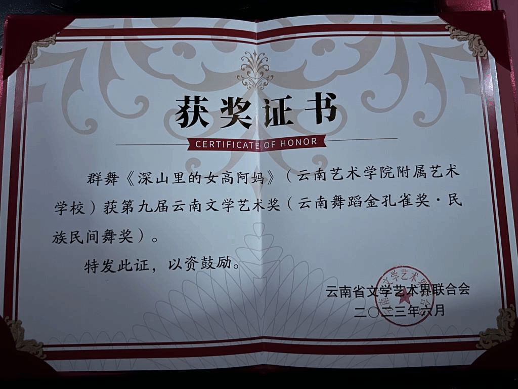 由云南省文联主办、省级各文艺家协会承办的第九届云南文学艺术奖于近期揭晓。我校原创傈僳族群舞《深山里的女高阿妈》及原创藏族群舞《牛·弦·情》喜获第九届云南文学艺术奖,在舞蹈类民族民间舞八个获奖作品中分别排名第二、第四,填补了学校办学以来在该领域奖项中的历史纪录。7月11日晚,原创藏族群舞《牛·弦·情》作为优秀作品代表再次登上颁奖晚会的舞台,获得了现场观众的阵阵掌声。