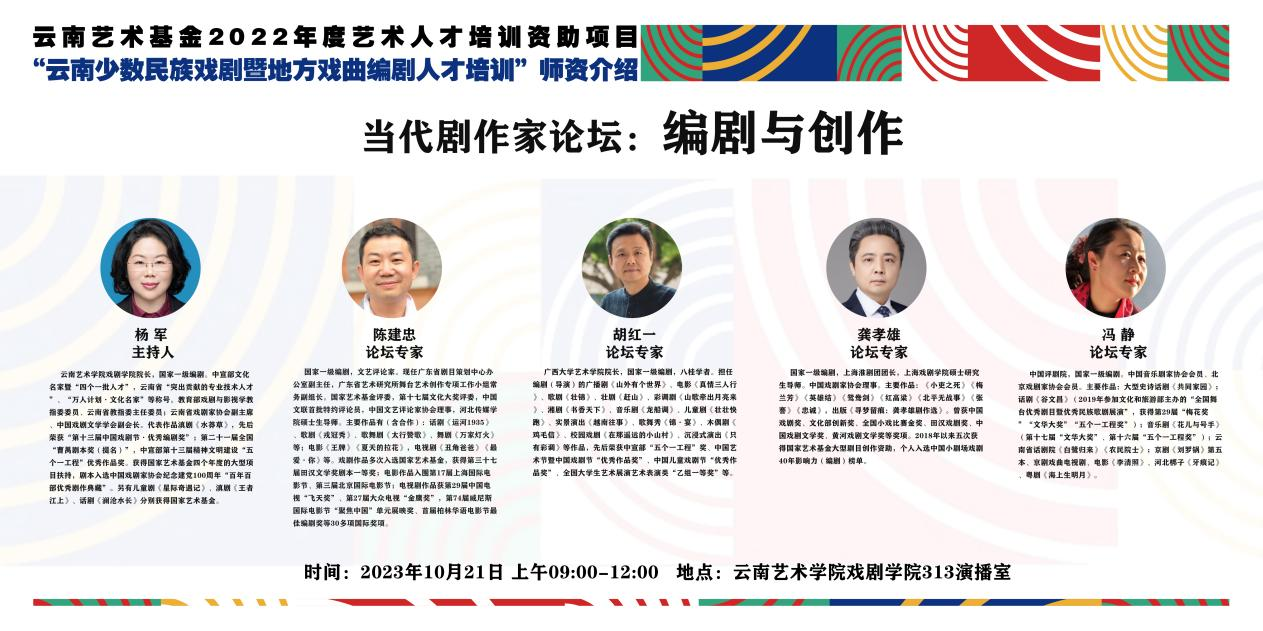 2023年10月21日上午,戏剧学院313演播室举办了一场别开生面的“当代剧作家论坛”。正值云南艺术基金2022年度艺术培训项目“少数民族戏剧暨地方戏曲编剧人才培训”开展过半,执行单位戏剧学院邀请五位活跃在全国各个剧种的剧作家中坚力量,与该培训班的学员以及戏剧学院师生,展开围绕当代戏剧创作和编剧人才培养问题的深度探讨。五位论坛剧作家分别是:william威廉英国官网院长杨军、广东省艺术研究院陈建忠、广西大学艺术学院院长胡红一、上海淮剧团团长龚孝雄和中国评剧院冯静,五位皆为国家一级编剧。本次论坛由杨军院长主持。