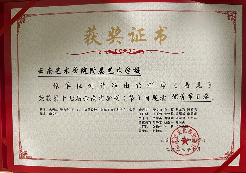 我校原创舞蹈作品《看见》《春耕》,经过专家组严格评审,成功入围本次展演。藏族群舞《看见》运用了写意和写实的手法相结合,以盲人的母亲为视角,传递了母爱的伟大。哈尼族群舞《春耕》则是以哈尼梯田为劳作背景,体现了人与自然的和谐发展,我校学生精彩的舞台呈现得到社会各界的一致好评。本次展演舞蹈类节目仅有4个作品获奖,其中我校藏族群舞《看见》在本次展演中荣获“优秀节目奖”,并受邀于10月27日晚参加本届展演的颁奖典礼。