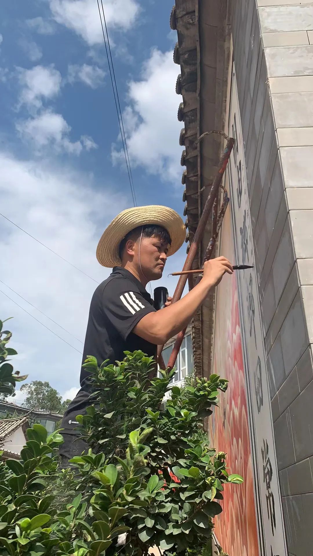 中午时分,巍山县南诏镇自由村委会大门外,41岁的龚栋强头戴草帽,手提錾子和小锤,蹲在一块红砂石的石条上,俨然一位地地道道的石匠。“坝头”两个字是他正在雕刻的内容,“上面是我设计的村名印章标志,接下来我还会在石条的中间位置雕刻书法和彝文村名,下面雕刻上自由村的简易地图。”
