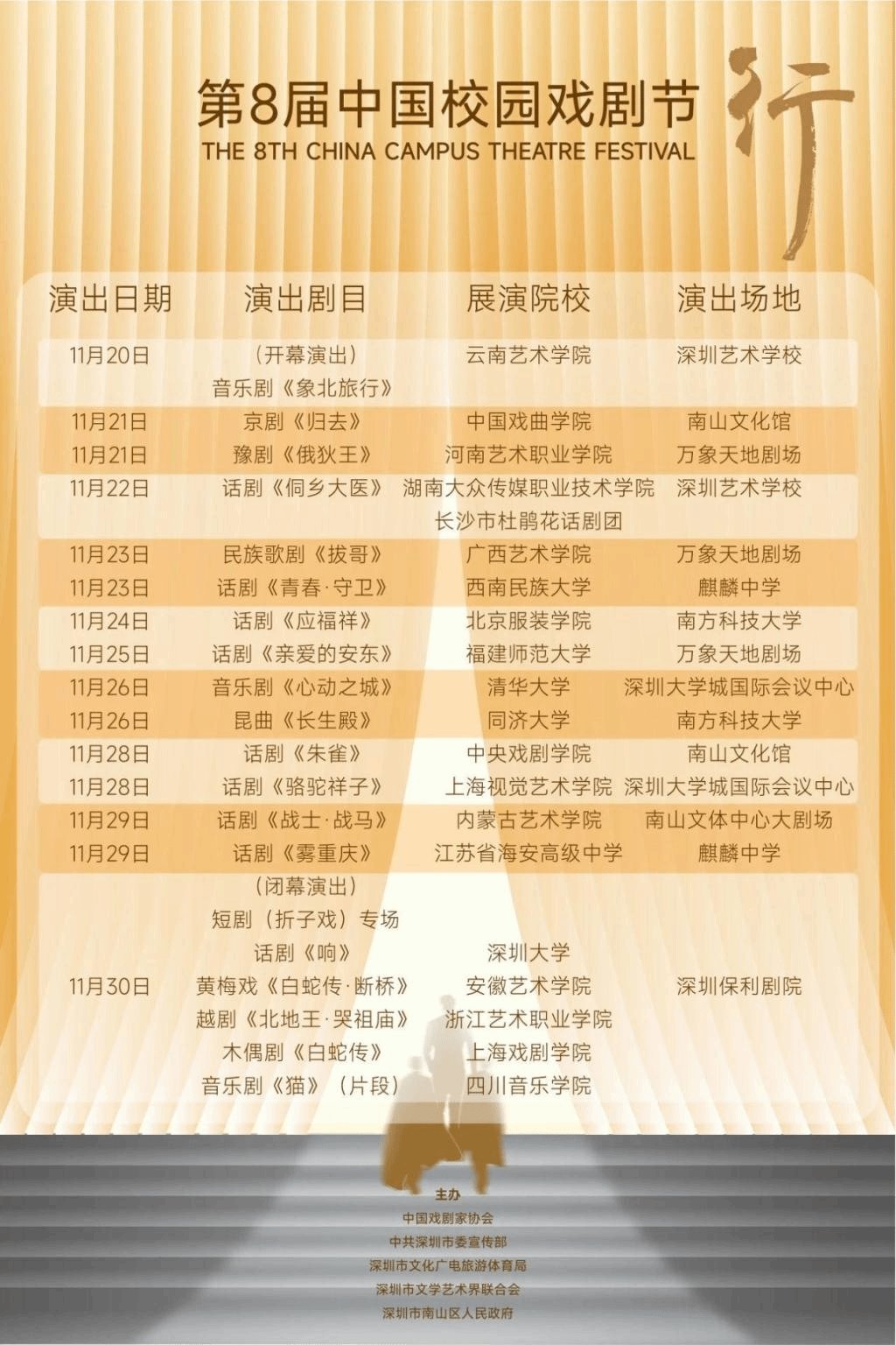 中国校园戏剧节是中国戏剧家协会于2008年创办的国家级校园戏剧节,每两年举办一届,已在上海、北京、深圳举办了七届。本届校园戏剧节由中国剧协、深圳市委宣传部、深圳市文化广电体育旅游局、深圳市文联、深圳市南山区政府共同主办,将于2023年11月20日至30日陆续上演从全国高校选拔的19个精彩剧目,包括14台大戏和5个短剧(折子戏)组成的专场。这些演出涵盖了话剧、戏曲、歌剧、音乐剧、儿童剧、木偶剧等多种样式,既有经典改编或文学改编作品,表现学生校园生活或与本院校专业紧密结合的原创作品,也有富有民族风情或地方特色的优秀作品。