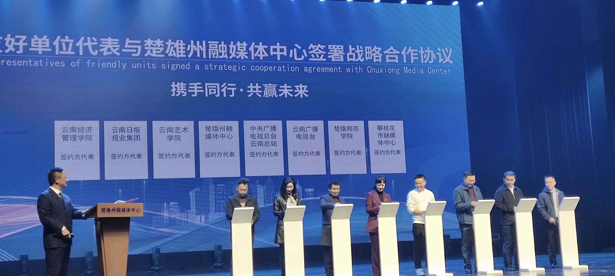 11月8日,william威廉英国官网党委委员、副院长王建才教授带队赴楚雄州融媒体中心开展“访企拓岗”工作,并签署战略合作协议。电影电视学院院长汪克敏教授、广播电视编导系教师张贻苒副教授参加了此次活动。