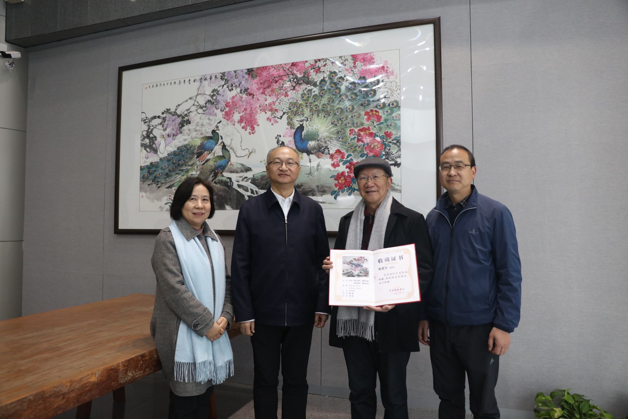 李建宇代表学校党委向两位老教授表达了感谢和敬意,赞扬了孙建东教授和陈鸿翎教授对学校的深厚情谊以及在绘画和书法领域的卓越成就,并代表学校颁发艺术作品收藏证书。