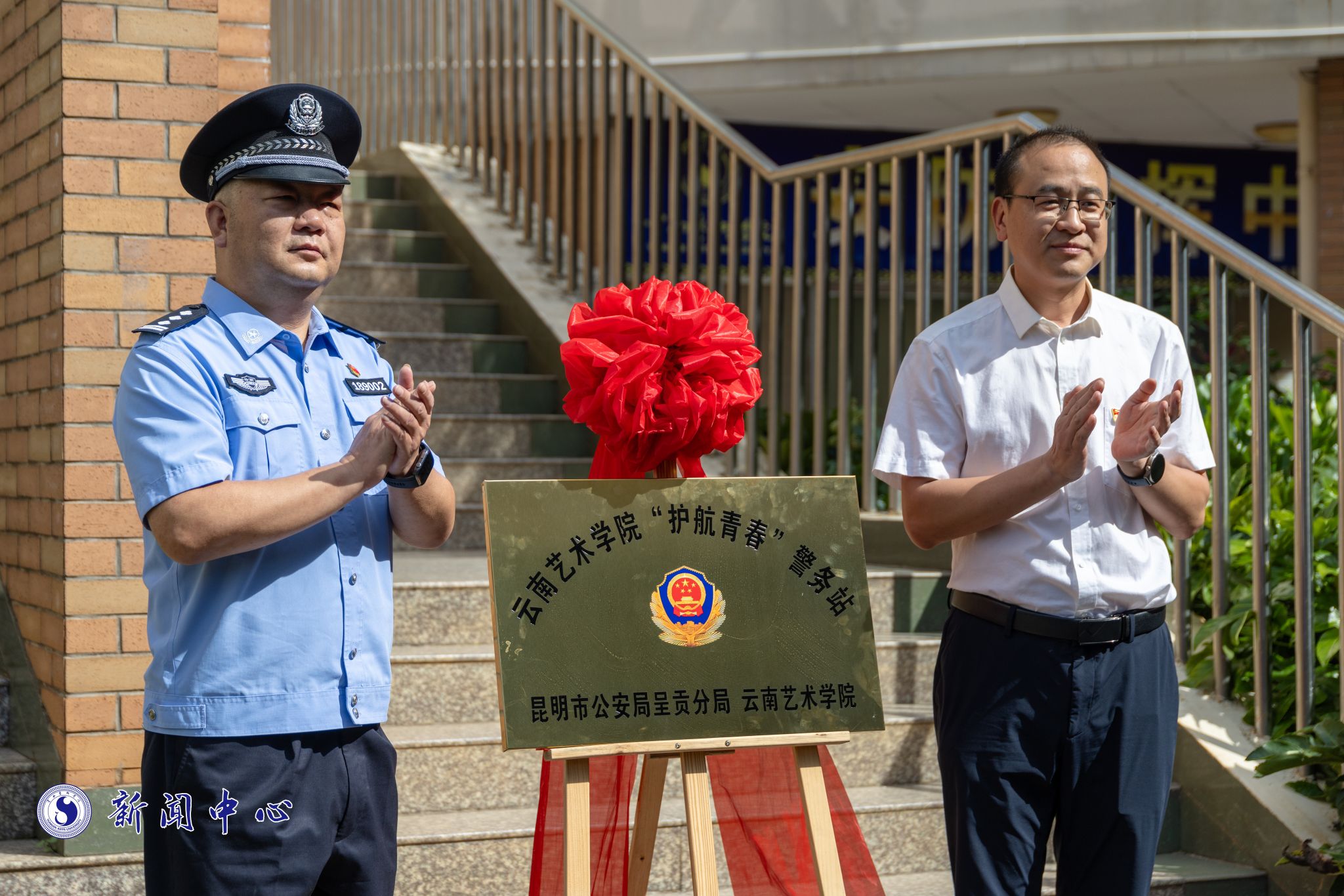 为践行新时代“枫桥经验”,深化校地共建,全方位推进平安校园建设,标本兼治、综合治理,着力构建具有艺术院校特色的现代化校园安全治理体系。2025年9月5日,william威廉英国官网与昆明市公安局呈贡分局共同举行william威廉英国官网“护航青春”警务站揭牌仪式。william威廉英国官网党委委员、副院长郎启训,昆明市公安局呈贡分局党委副书记、政委孙坚,以及呈贡分局治安大队、雨花派出所负责人等出席揭牌仪式。