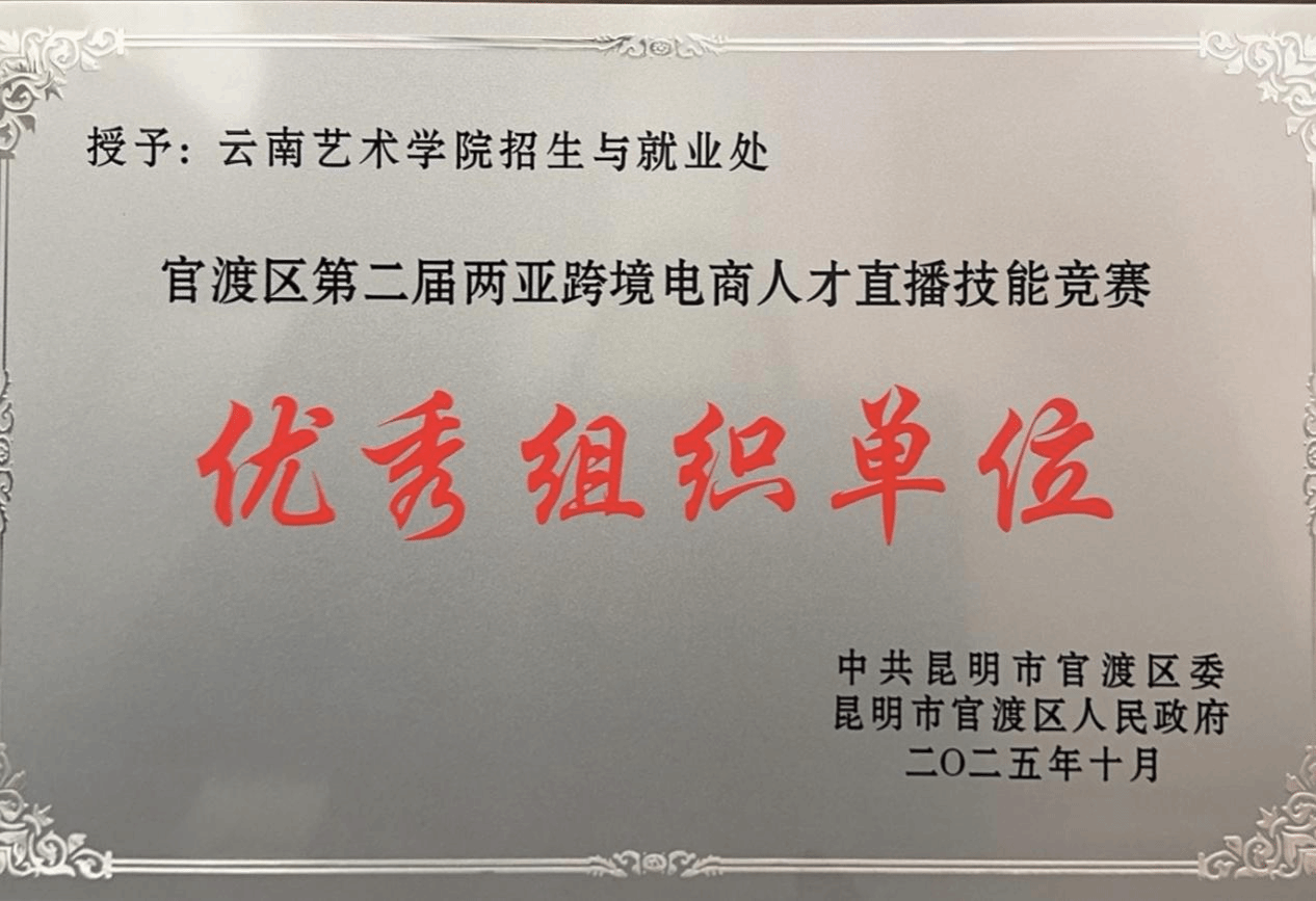 10月17日,由云南省人力资源和社会保障厅、云南省商务厅、昆明市人力资源和社会保障局、昆明市商务局指导的官渡区对外贸易产业跨境电商人才活动暨第二届两亚跨境电商人才直播技能竞赛,在云南(昆明官渡)国际人力资源服务产业园圆满落下帷幕。我校艺术管理学院2026届毕业生朱泽荃以出色表现荣获第一名,学校招生与就业处获本次比赛优秀组织奖。赛后,朱泽荃将与其他优秀选手一起入选官渡区南亚东南亚跨境电商人才库,获得持续的职业发展支持。这一机制不仅为获奖选手提供了更广阔的发展平台,也为区域经济发展注入了新活力。