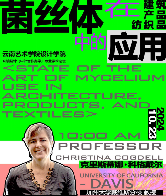 2024年11月4日-26日,加州大学戴维斯分校设计系CHRISTINA COGDELL(克里斯蒂娜 科格戴尔)教授受我校邀请到学校讲学。在为期近一个月的教学中,克里斯蒂娜·科格戴尔教授将聚焦环境设计领域前沿科技,以跨学科的学术视野,向设计学院环境设计专业本科学生展示加州大学戴维斯分校设计系在“设计+自然科学”方面创新探索的最新成就。克里斯蒂娜·科格戴尔教授在“菌丝体在建筑、产品和纺织品中的应用”专题讲座中阐述了菌丝体作为新兴生物材料的科学原理,强调其在应对全球气候变化与推动可持续发展方面的重要作用并详细介绍了菌丝体在建筑、产品及纺织行业应用中的广泛潜力,其卓越的保温、阻燃、防水性能以及对环境影响的极低程度,使之成为替代传统材料的优选,揭示了跨领域应用的无限可能。