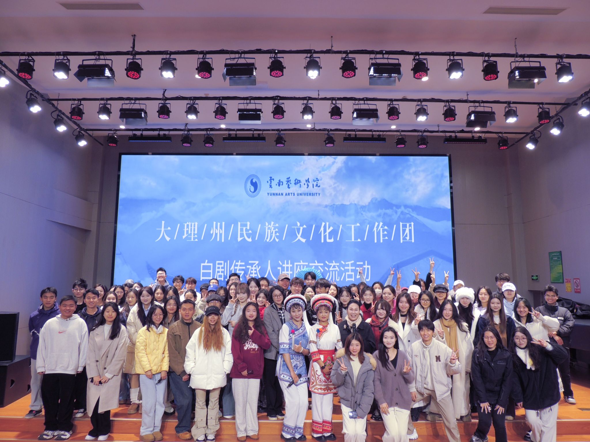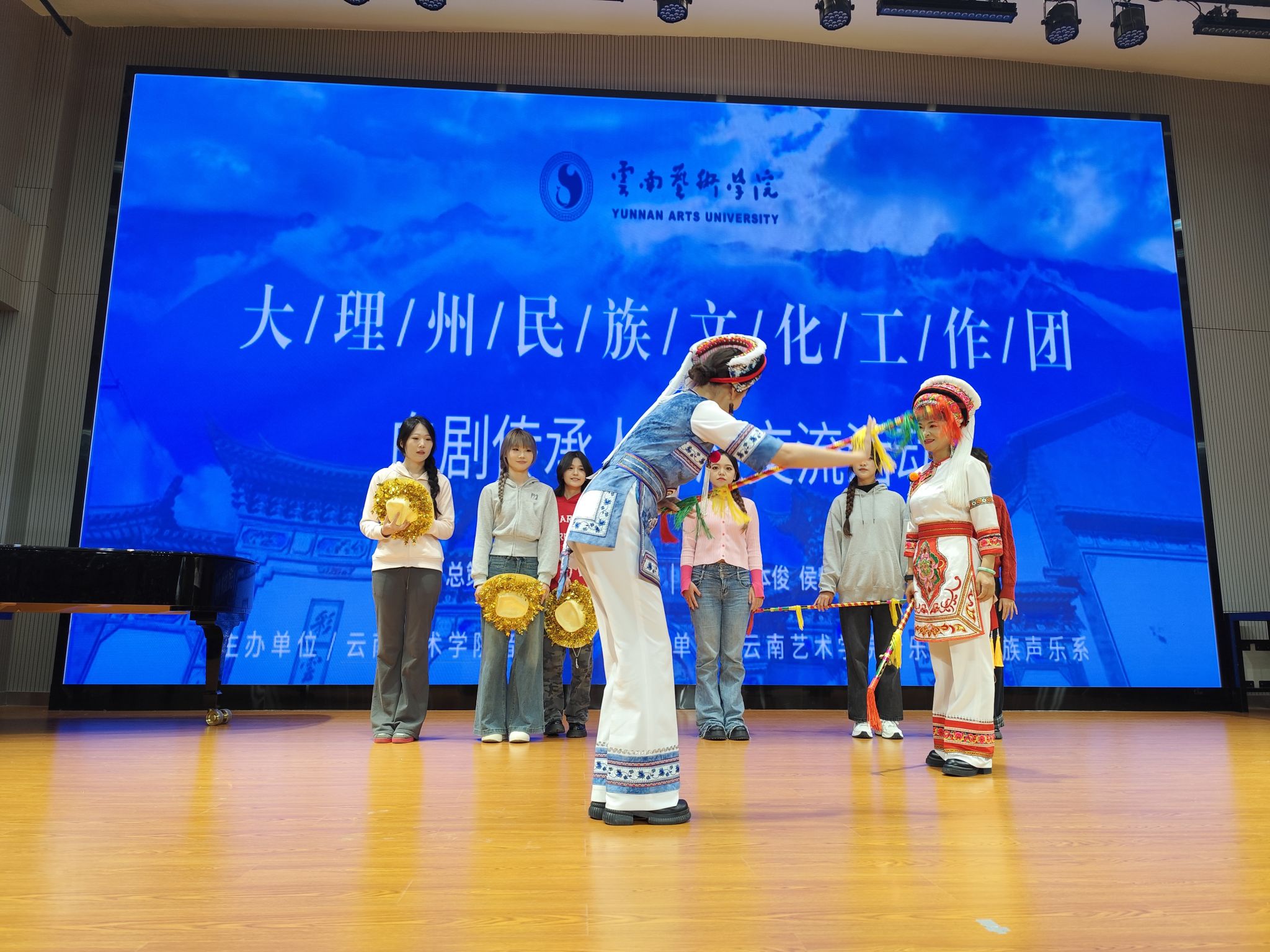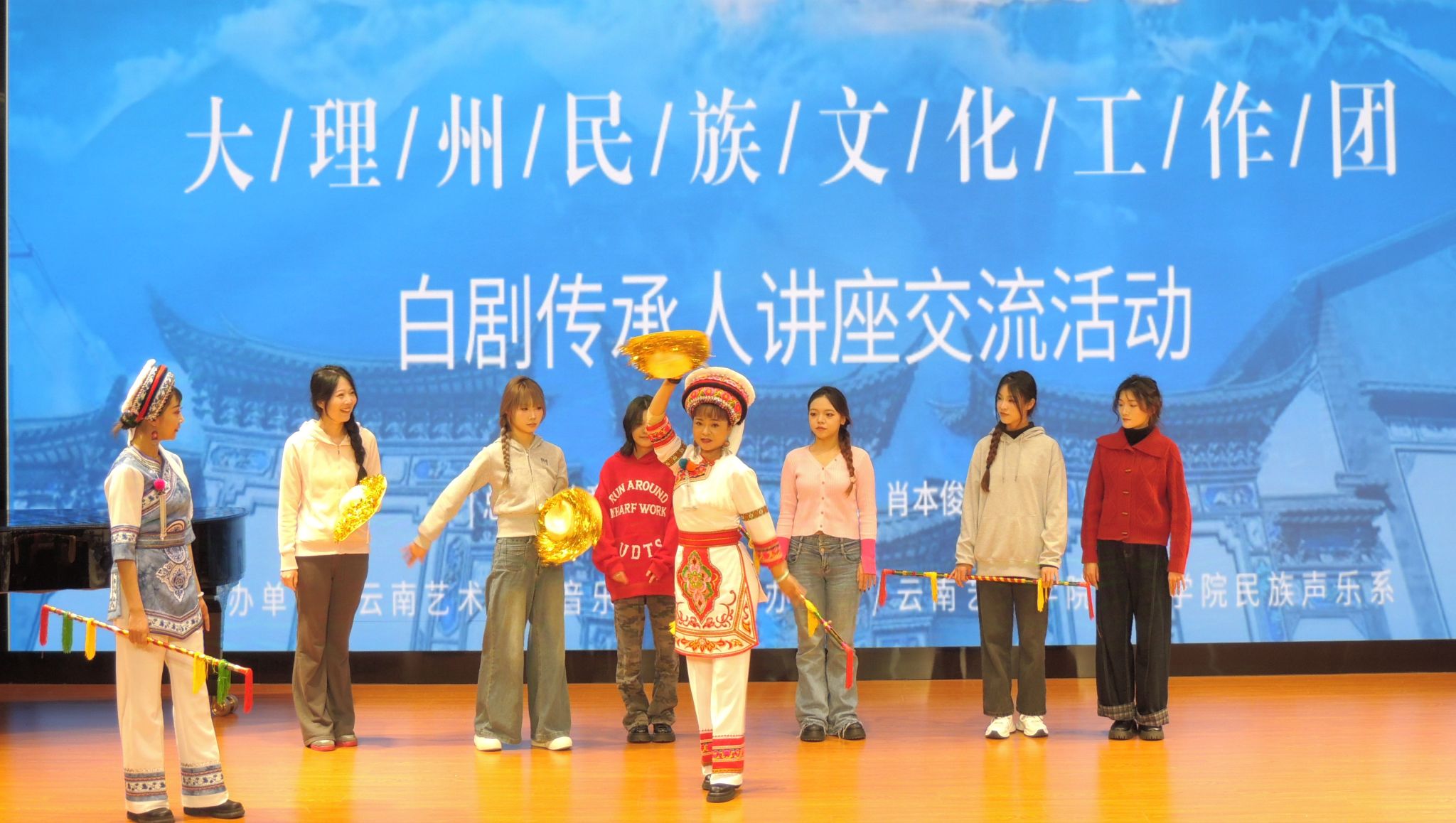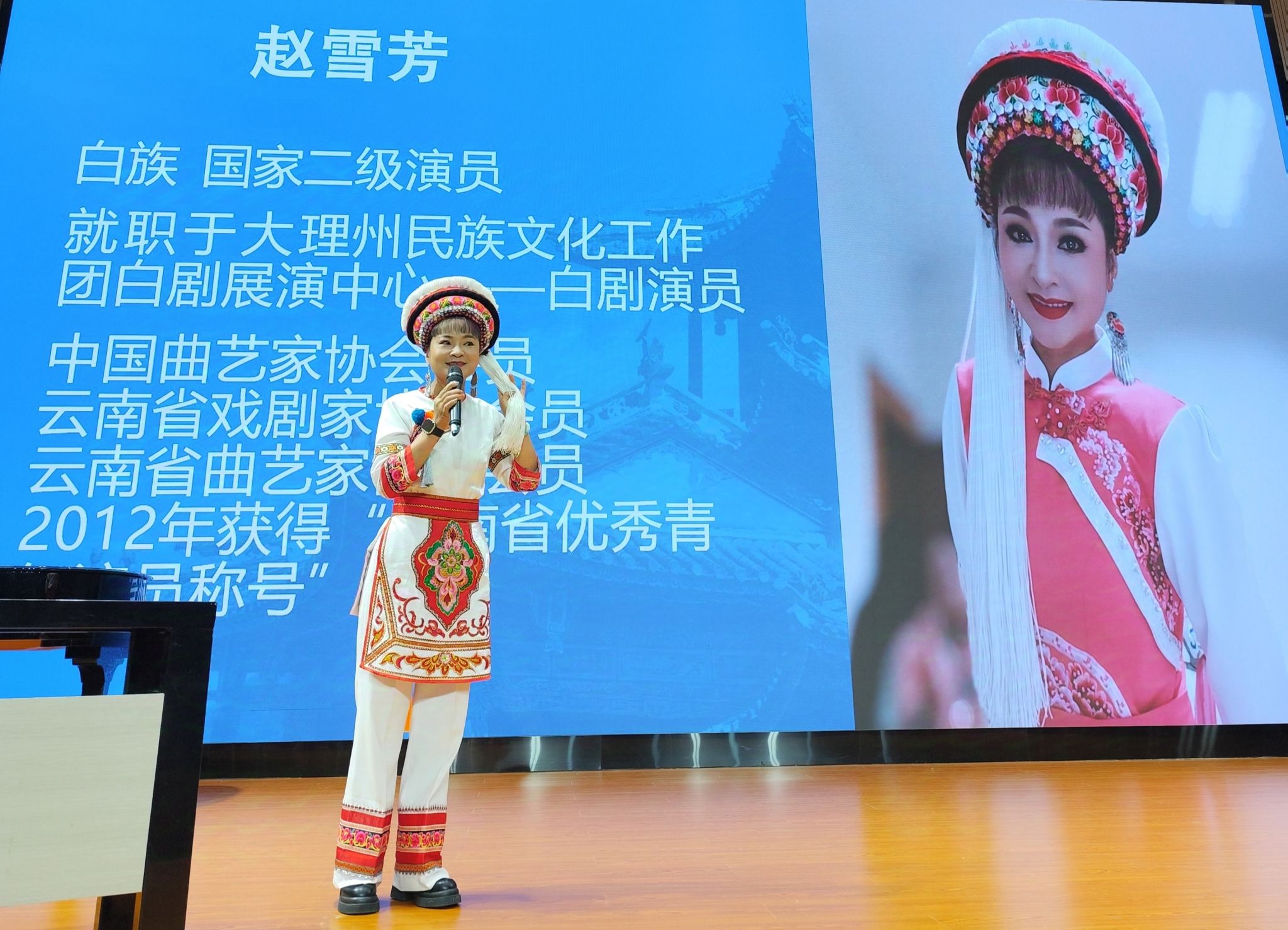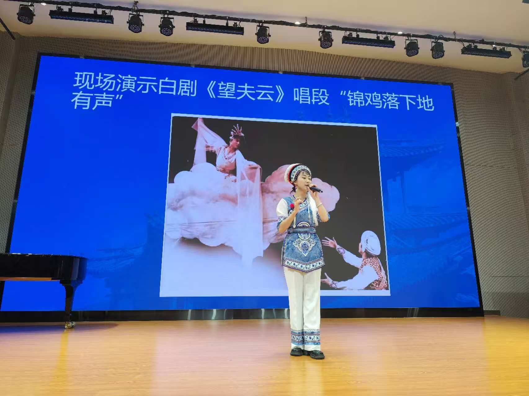 讲座伊始,国家二级演员、中国曲艺家协会会员、云南省优秀青年演员赵雪芳老师首先向在座师生详细介绍了白剧的起源、唱腔特色、表演特征等方面的内容。随后,大理州民族文化工作团优秀青年演员、大理州文艺调演个人表演金奖获得者董润坪老师,向同学们介绍了自己参演的白剧经典剧目《望夫云》,并现场演唱了其中的经典唱段。两位老师还合作演唱了颇具代表性的白剧选段以及白族民歌《麻雀调》《蝴蝶泉边》《锦鸡落下地有声》等曲目,还就白剧演唱发声方法和演唱技巧向同学们进行了细致的讲解与分享。