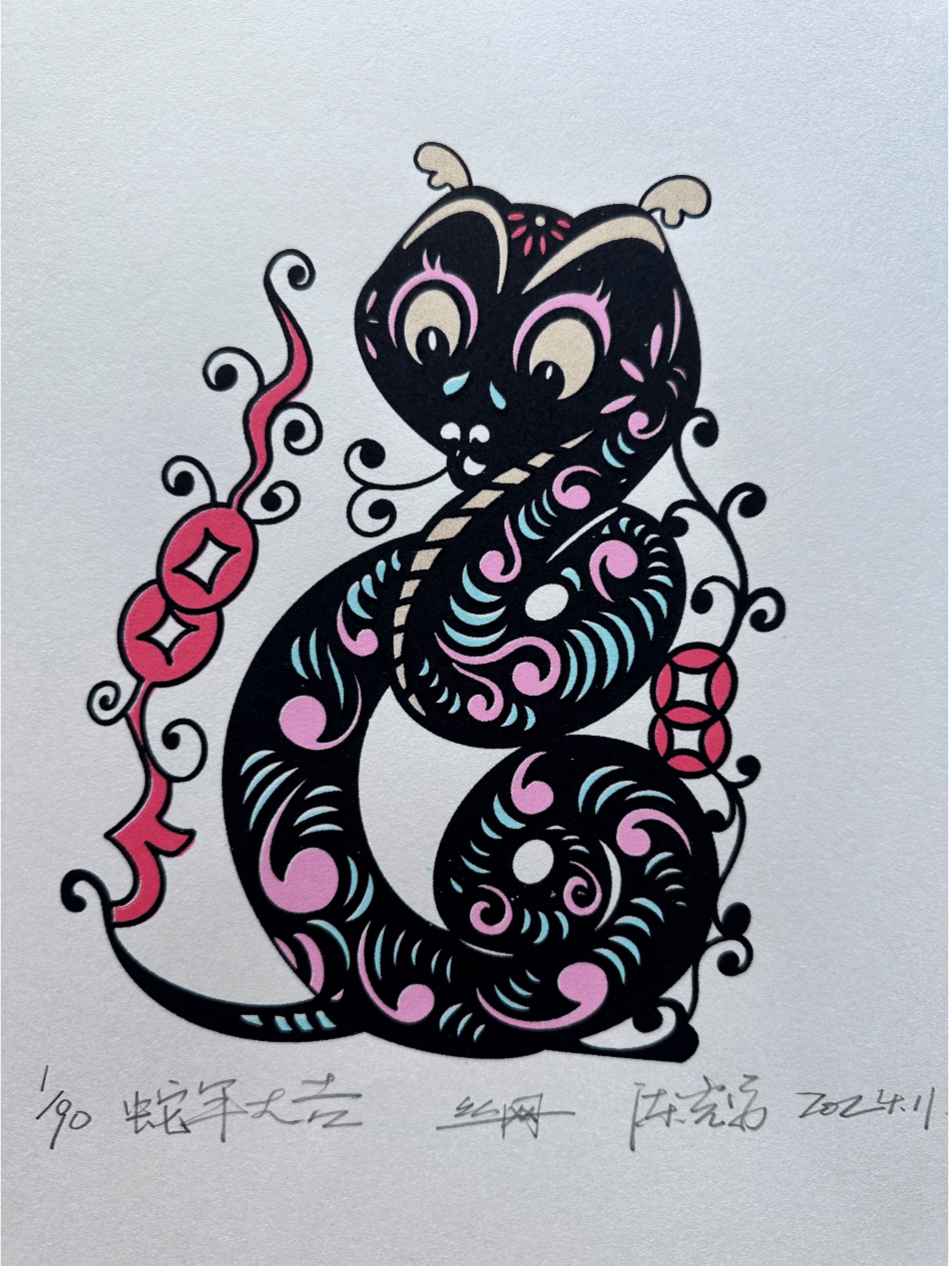 《金蛇报喜》 绝版套色木刻 11×12CM 许旭华 2024年
