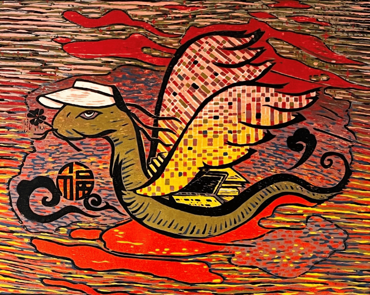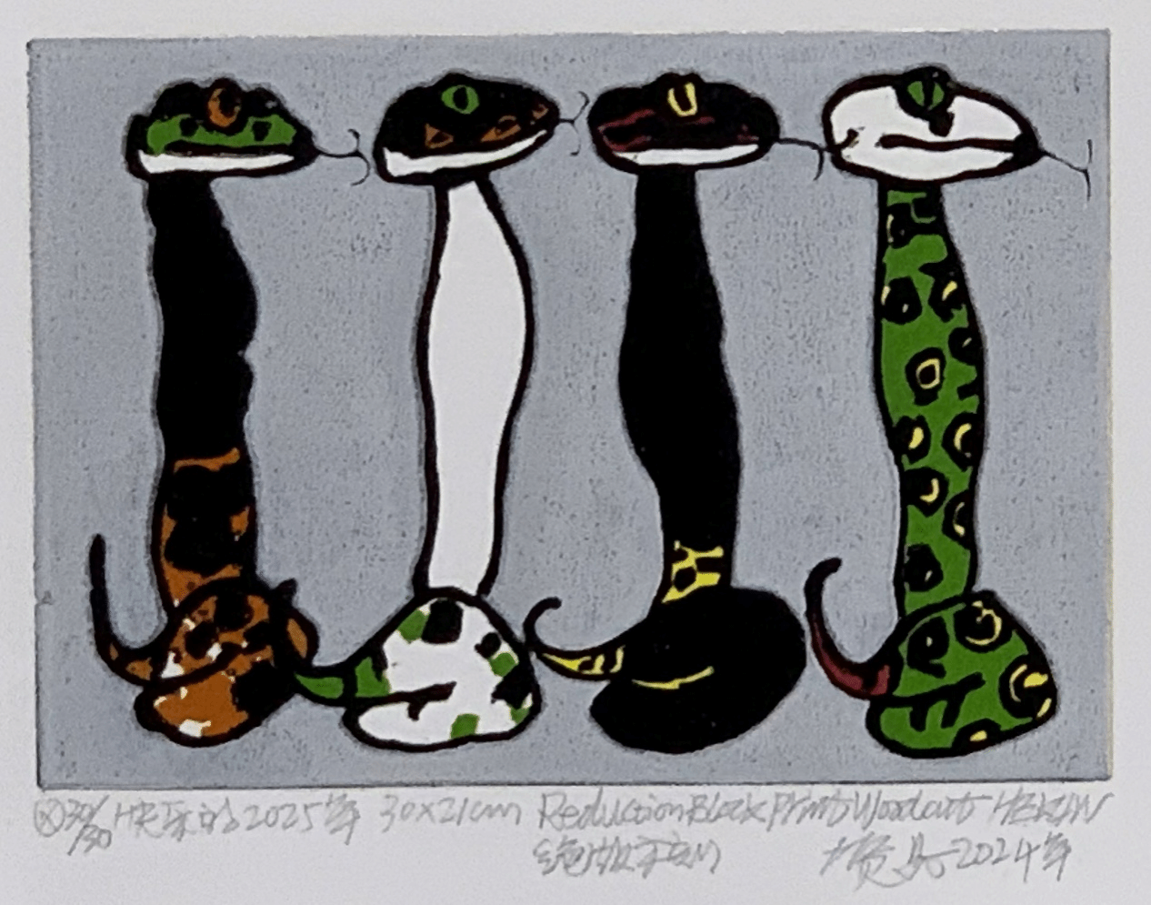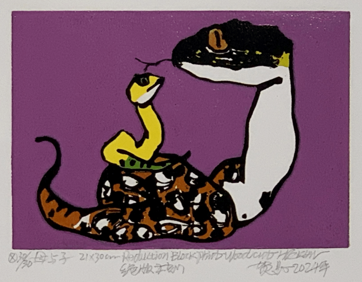 《蛇擁財星》 木版套色 20×15CM 王富生 2024年
