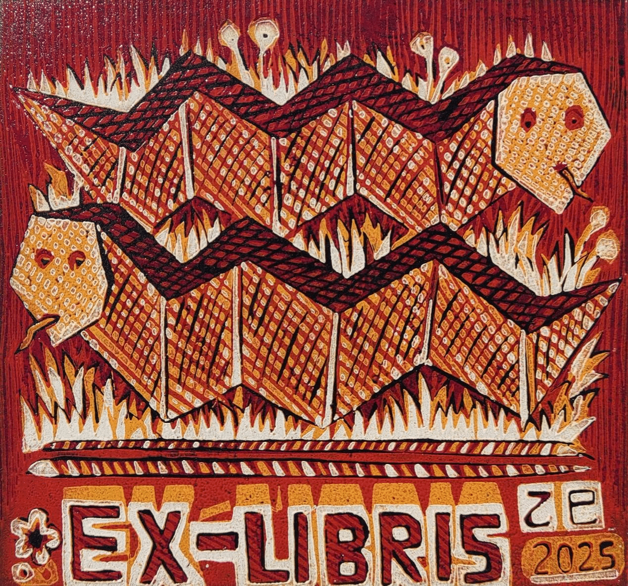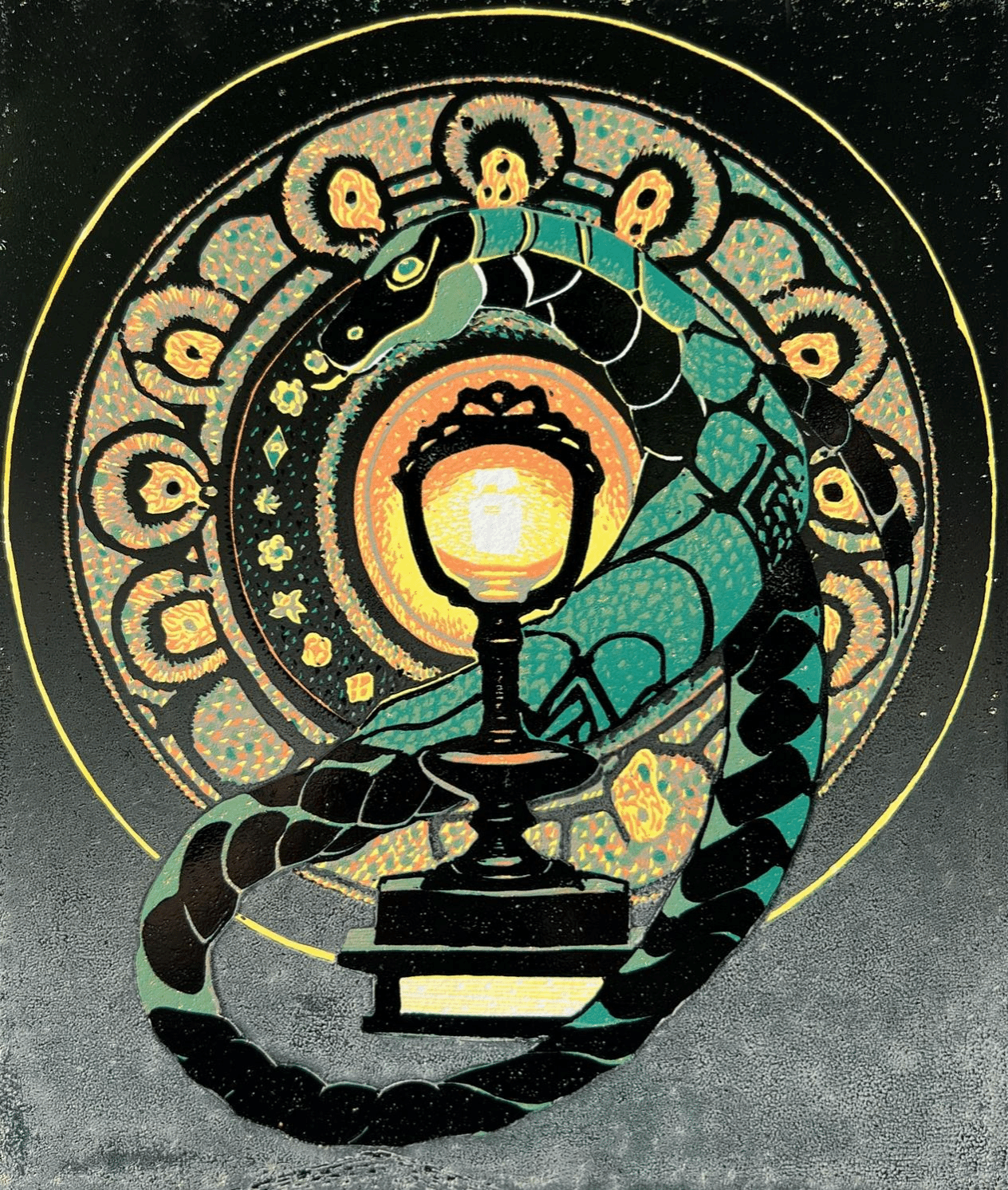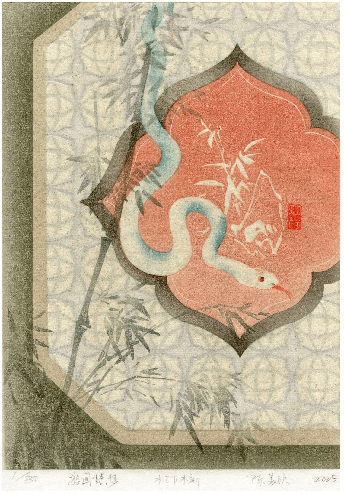 《蛇擁財星》 木版套色 20×15CM 王富生 2024年