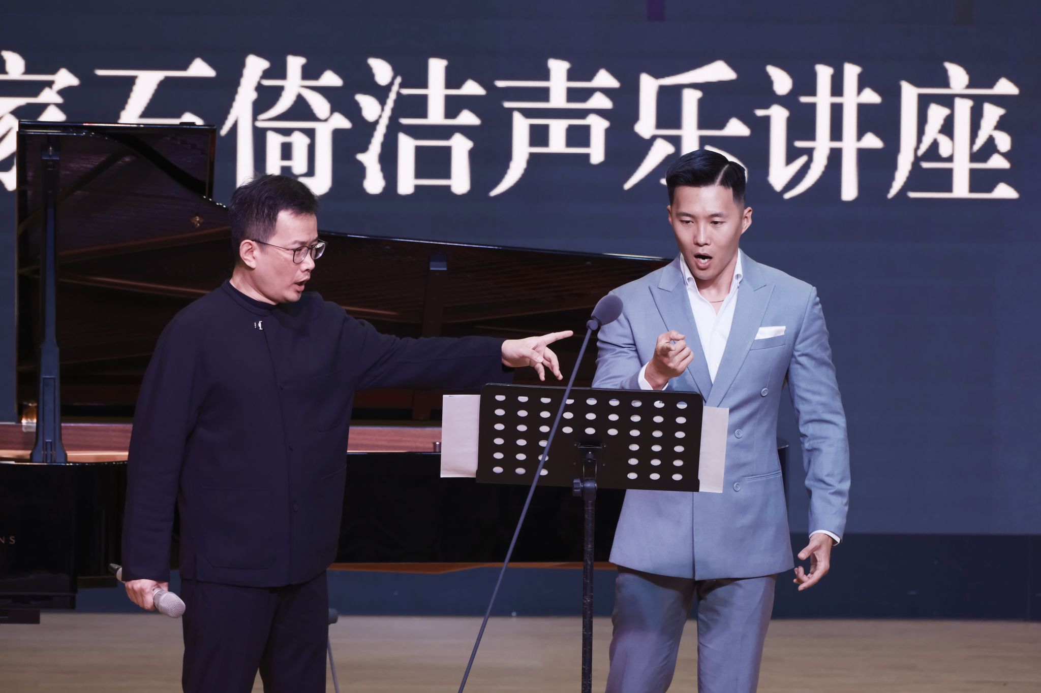 实践指导环节将讲座气氛推向高潮。声歌系老师、硕士研究生先后登台演唱中外艺术歌曲、歌剧选段,石倚洁教授逐一进行现场指导。针对学员在演唱中出现的音色、作品风格、情感表达不足等问题,他不仅耐心地讲解和引导,还亲自示范教学。在语言咬字方面,他细致地讲解了外国作品的语言规则,以及中文作品的声韵特点。