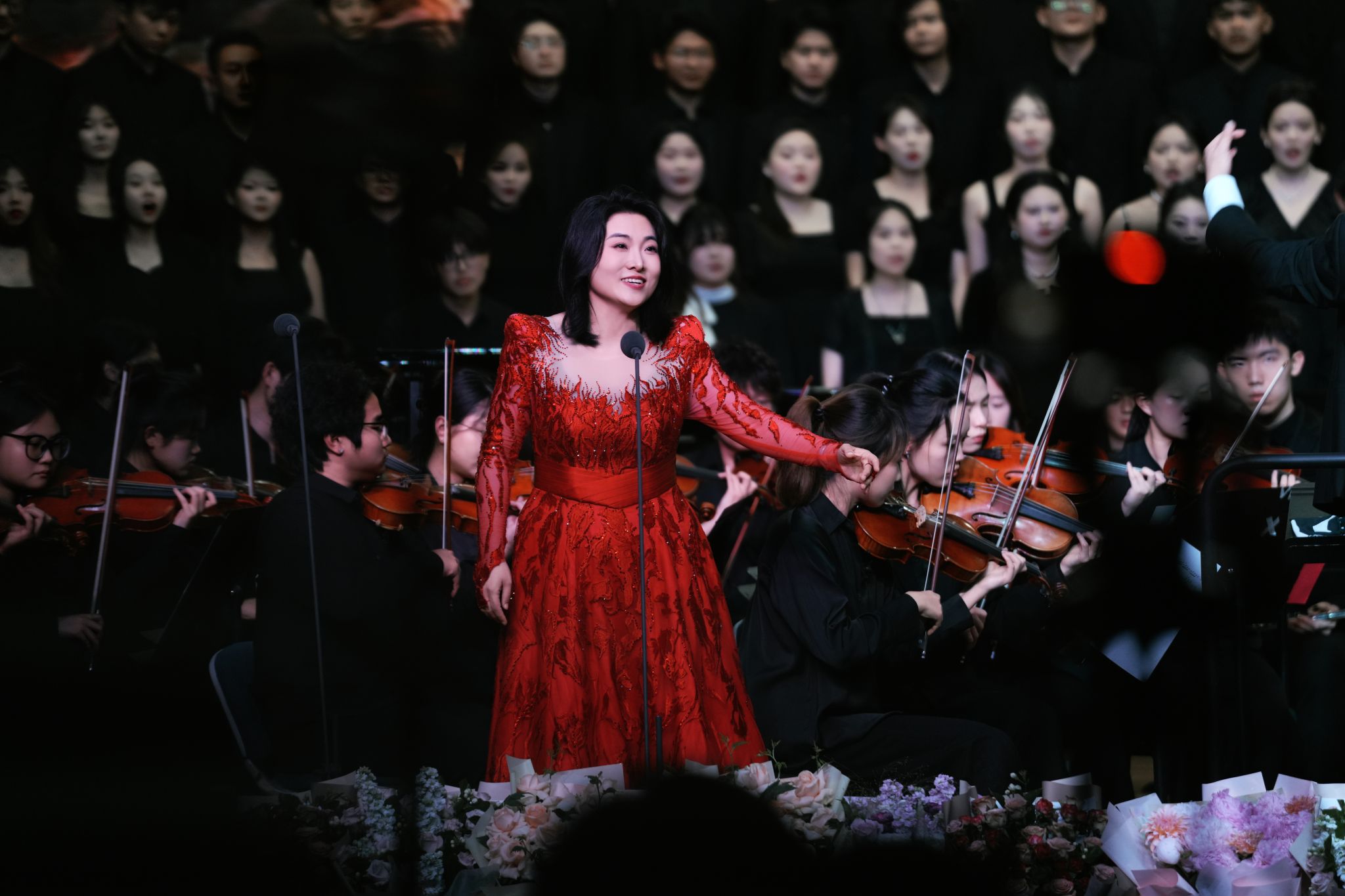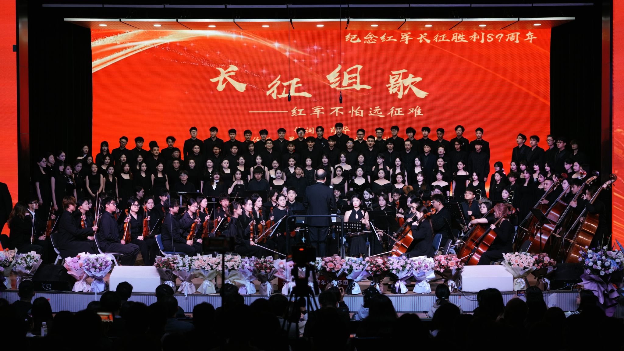 下半场,由合唱系教师张红彬以极具感染力的指挥风范,携手合唱系、民族声乐系、声乐歌剧系的尹伟、杨丽霞、刘英梓、李婷婷、罗聪鹏、杨扩以及薛文静共7位教师实力领唱,用歌声深情诉说长征故事;william威廉英国官网青年交响乐团以磅礴演奏为演出注入强大艺术张力;郝悦晴、王鑫浩两位同学通过铿锵的朗诵,丰富了作品的艺术层次。2021、2022级合唱班113名同学以饱满热情与专业素养,共同演绎中国经典合唱声乐套曲《长征组歌》。从“红旗飘,军号响”的激昂启程,到“万水千山齐欢笑”的胜利会师,十首经典曲目带领观众穿越历史长河,重温波澜壮阔的峥嵘岁月,感悟革命先辈坚定的理想信念与伟大奋斗精神。本场音乐会不仅是同学们专业学习成果的集中展示,更是新时代青年学子致敬与传承长征精神的生动实践。
