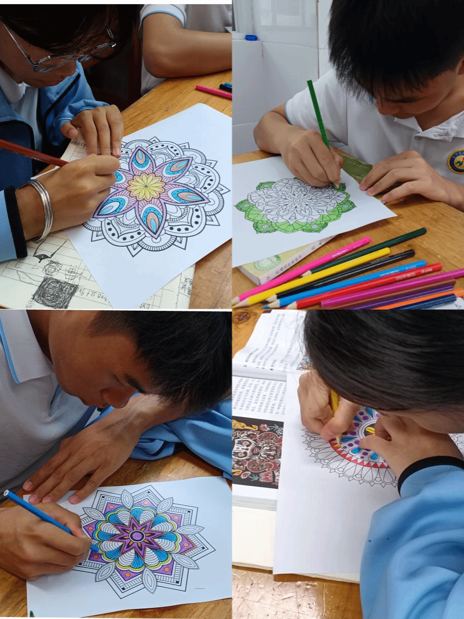范文杰同学还开设了曼陀罗心理疗愈绘画课程。让学生在舒缓的音乐声中,暂时放下学业压力,全身心沉浸在绘画创作的空间中。不仅帮助学生释放了压力,还提升了他们的情绪管理能力和自我认知水平,为学生的心理健康保驾护航。