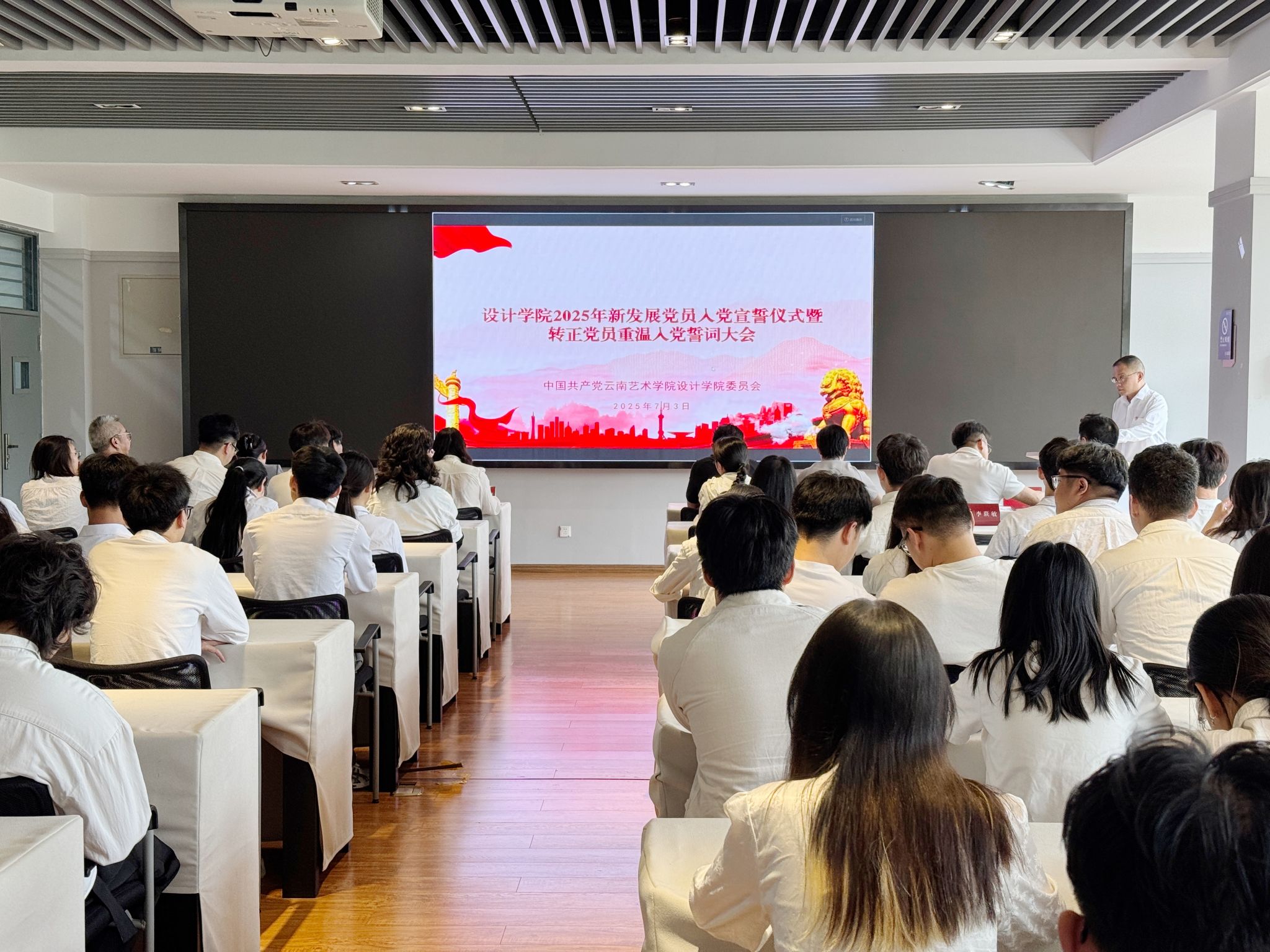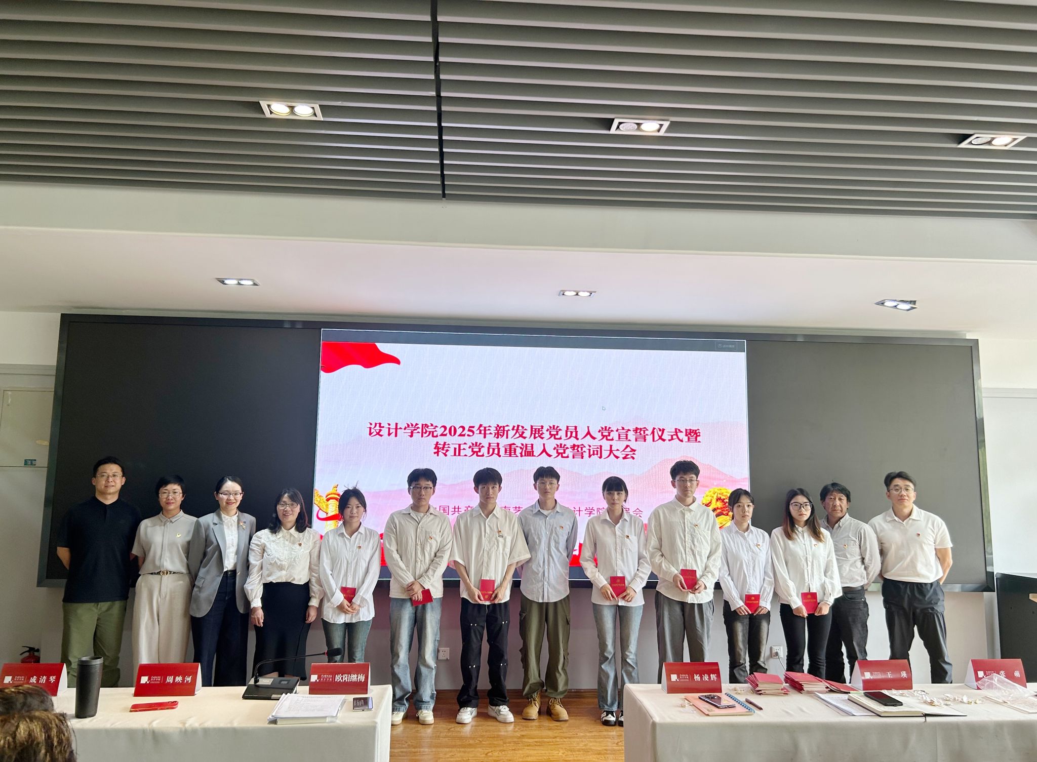 仪式在庄严雄壮的《中华人民共和国国歌》声中拉开帷幕。学院党委组织委员成清琴同志宣读了设计学院党委2025年上半年新发展的40名预备党员名单及27名按期转正党员名单。学院党委副书记、纪委书记欧阳继梅,党委委员、副院长杨凌辉等同志为新发展党员逐一郑重佩戴党徽,并颁发《中国共产党章程》。