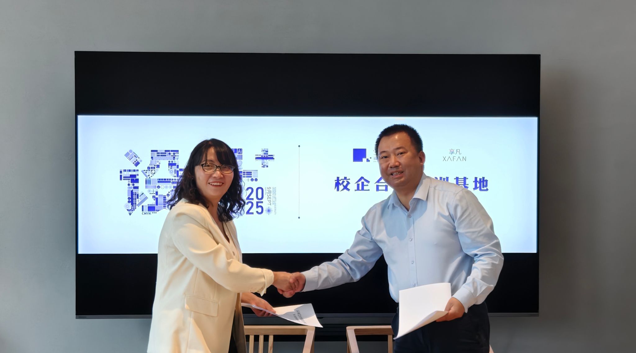 活动中,欧阳继梅副书记与徐启刚董事长代表校企双方签署《教学实训基地共建协议》,并为“设计学院教学实训基地”揭牌。