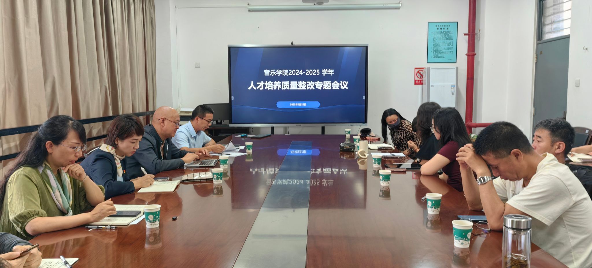 2025年9月22日下午,音乐学院在音乐楼A301会议室召开了2024-2025学年人才培养质量整改专题会议,会议由音乐学院副院长侯静宜主持,音乐学院党政领导班子、各系系主任、专业负责人、教学管理科科长、学生管理科科长、教师代表及学生代表参加了会议。