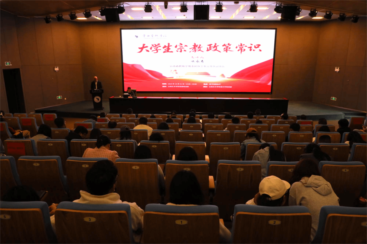 施永寿结合自身丰富的工作实践,从习近平总书记关于宗教工作的重要论述、云南宗教概况、党的宗教政策三个方面进行专题辅导。他深入解读了习近平总书记关于宗教工作的重要论述的深刻内涵、党的宗教政策,结合云南省情与高校实际,系统讲解了“教育与宗教相分离的原则”,宗教与迷信、邪教的区别。讲座内容贴合高校师生工作学习实际,对师生准确理解我国宗教政策和法律法规、正确认识和对待宗教,牢固树立正确的国家观、历史观、民族观、文化观、宗教观,全面贯彻落实总体国家安全观具有很强的实践指导意义。
