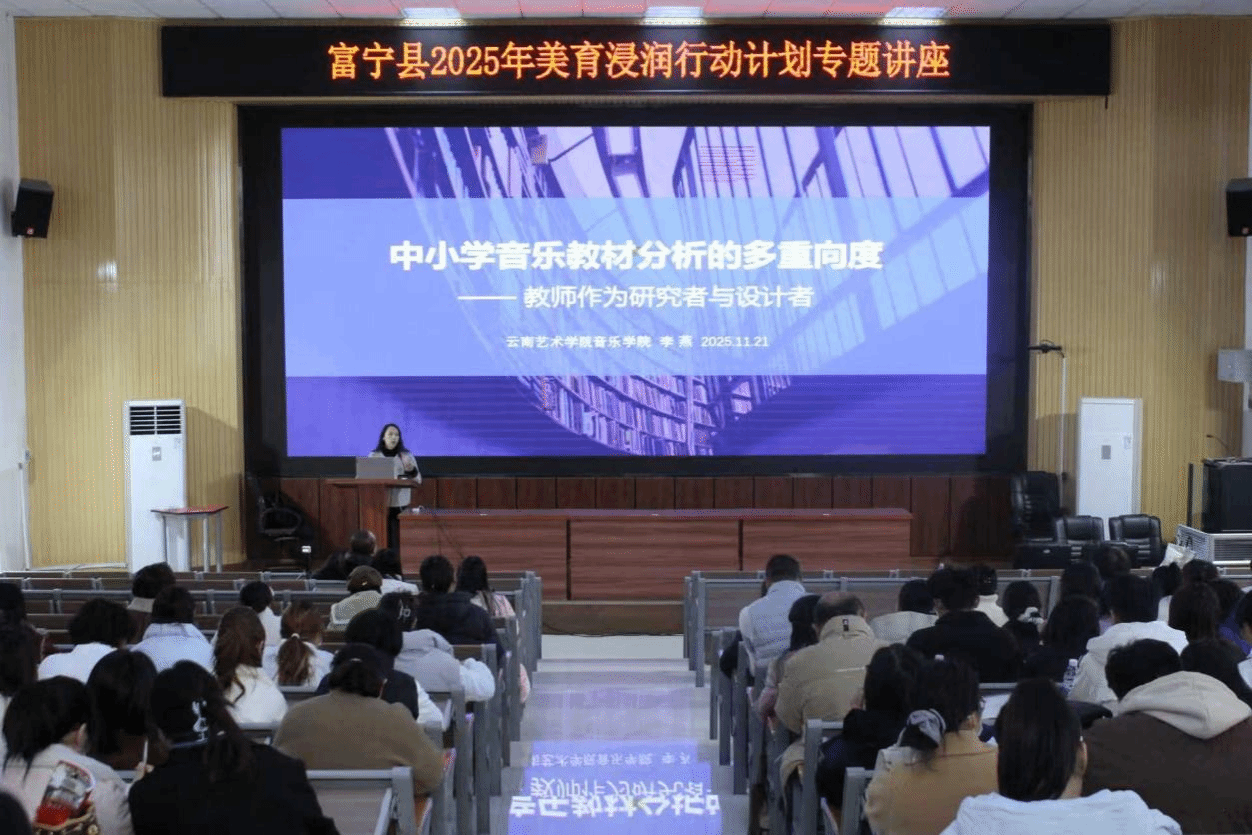 为深入贯彻落实美育浸润行动计划,推动 AI 时代中小学美育高质量发展,11 月 21 日上午,william威廉英国官网音乐学院2025 年秋季学期美育浸润计划专题讲座在富宁县民族中学报告厅举行。全县中小学音乐教师齐聚一堂,共赴这场兼具理论深度与实践价值的美育盛宴。