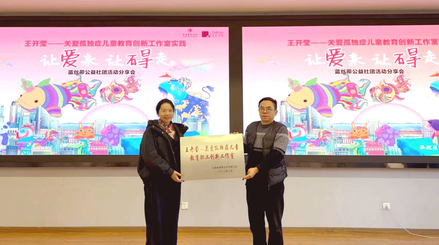 活动以学校蓝丝带公益社团成员朗诵的《蓝色和蓝色的你》拉开序幕。细腻的文字将孤独症儿童的内心世界娓娓道来,现场氛围瞬间沉静温暖。随后,学校工会常务副主席王进将“王开莹——关爱孤独症儿童教育职工创新工作室”的牌匾交予设计学院院长万凡,今后学院将为师生参与公益实践提供坚实保障。王进强调,工会将从资源对接、活动保障、平台搭建等多方面全力支持工作室建设,凝聚校园内外爱心力量,让这份温暖与担当传递得更稳、更远、更有力量。