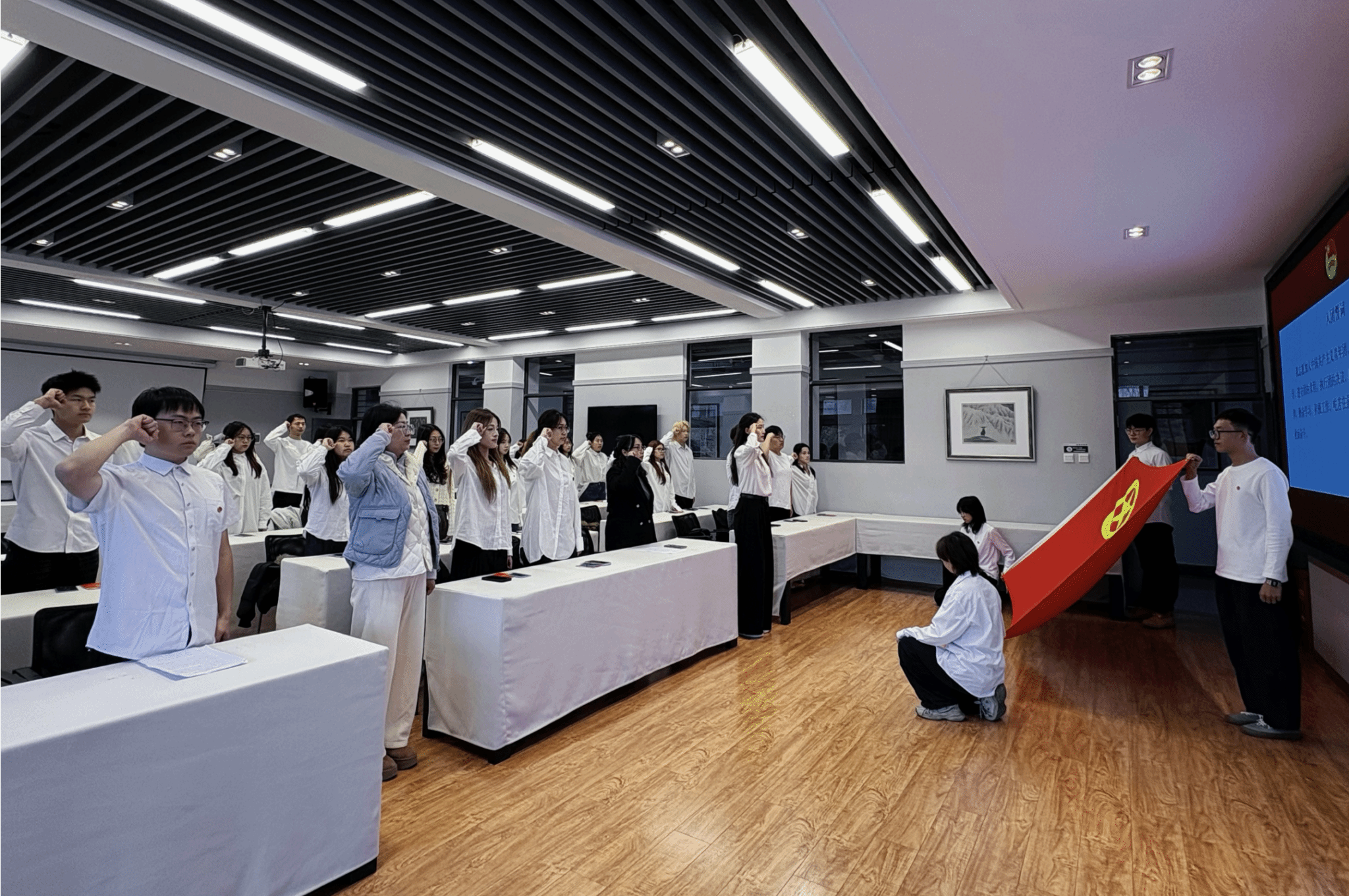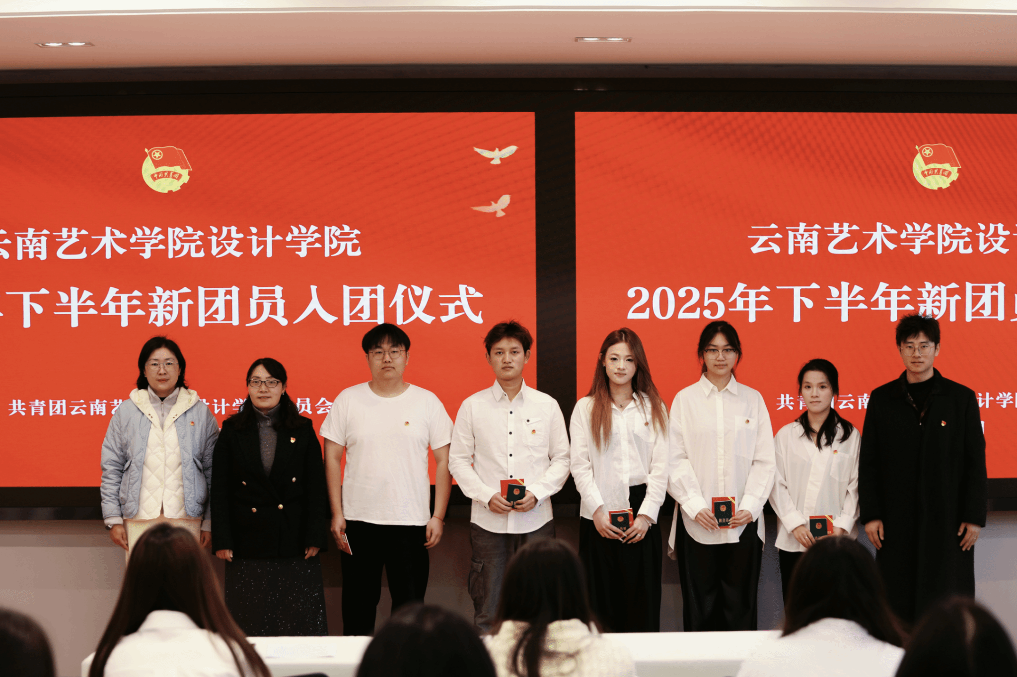 今年下半年,经团组织培养考察,设计学院22名先进青年被发展入团并参加本次入团仪式。入团仪式在庄严的国歌中拉开帷幕。王瑛老师宣布新团员名单;欧阳继梅、王瑛、柏云川老师为新团员佩戴团徽,颁发团员证;全体新团员面向团旗庄严宣誓,老团员重温入团誓词,铿锵誓言彰显青春担当。