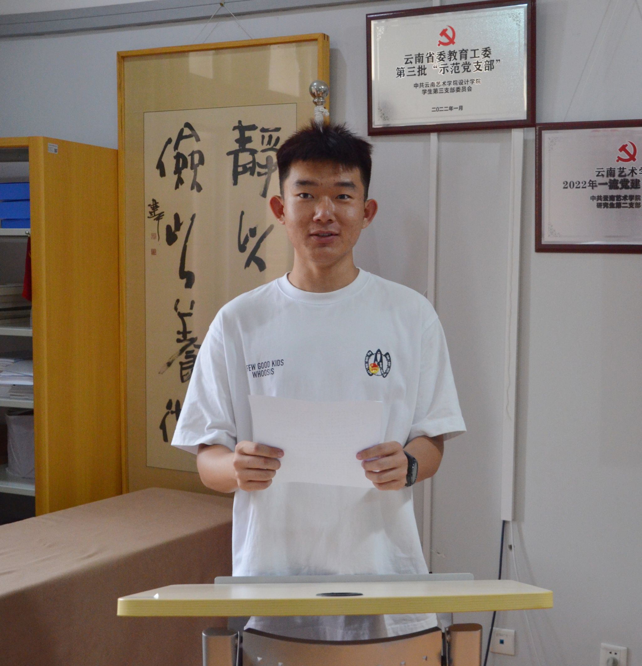 设计学院2022级产品设计1班的李佳杰同学作为优秀团员代表发言,他表示,作为一名团员青年,我们要积极践行和弘扬社会主义核心价值观,争做政治上的坚定者,思想理论上的先行者,学习上的佼佼者,工作中的贡献者,法律制度的模范执行者。要在学习和各项工作中发挥模范带头作用,向优秀共产党员看齐,让团旗紧跟党旗飘扬,以实际行动彰显新时代好青年的先进形象。