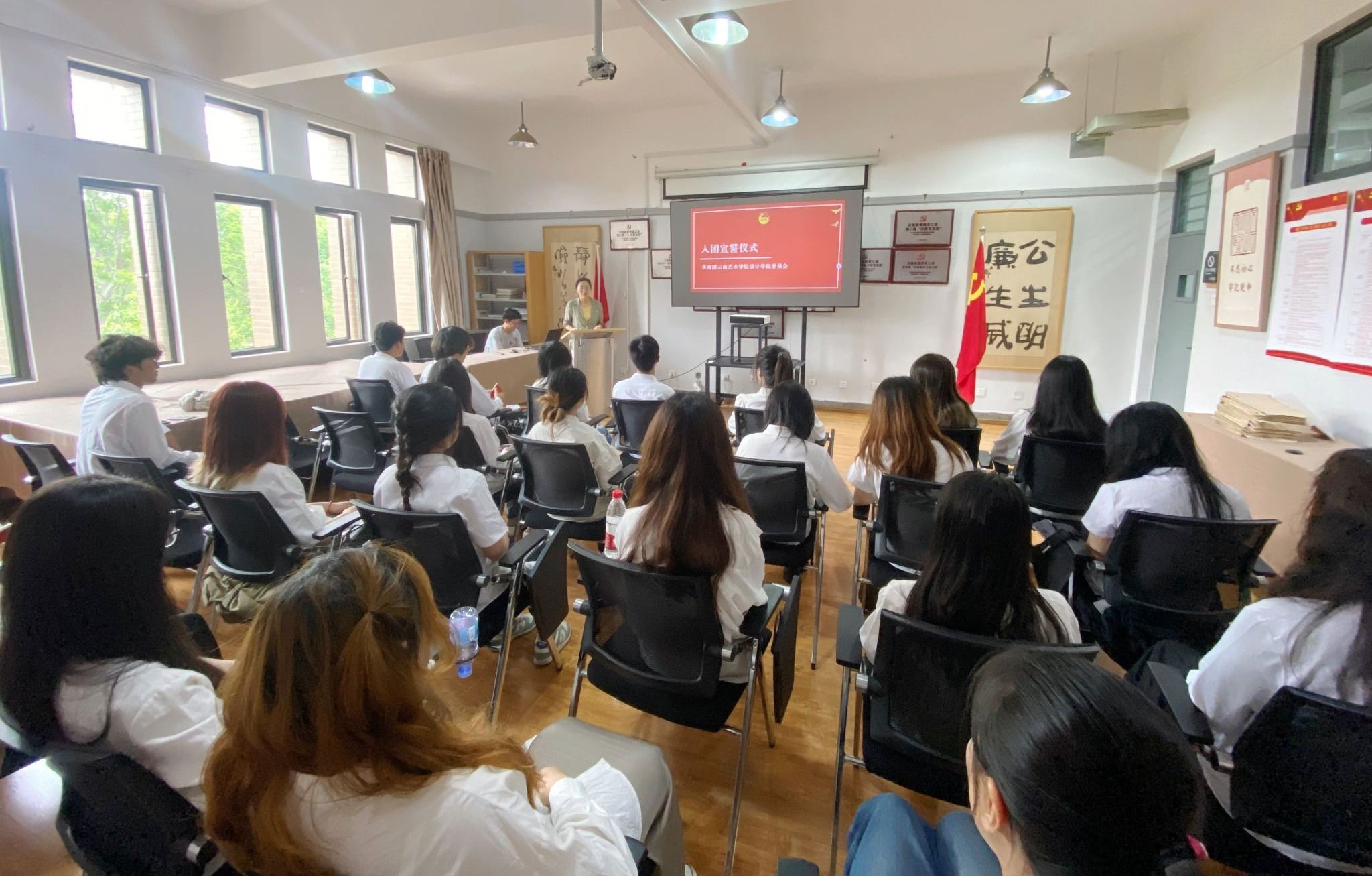 设计学院党委委员、团委书记王瑛老师向新团员们表示祝贺,并提出几点希望:一是坚定理想信念,做青春向党的有志青年。要深刻领会习近平新时代中国特色社会主义思想的精神实质和丰富内涵,用科学的理论武装头脑。要胸怀“国之大者”,坚定理想信念,成长为德智体美劳全面发展的社会主义建设者和接班人。二是练就过硬本领,做勤思善学的有识青年。希望新入团的同学们,以优秀学生为榜样,发扬学校优良传统,紧跟时代发展步伐,努力学习专业知识和技能,在学习中积累知识、锤炼品格、增长才干、练就本领。三是勇担时代重任,做挺膺担当的有为青年。青年一代有理想、有本领、有担当,国家就有前途,民族就有希望。希望大家牢记习近平总书记殷切嘱托,以实际行动践行云艺设计青年“请党放心,强国有我”的铮铮誓言。
