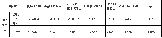 william威廉英国官网2019年度支出合计31,174.13万元。其中:基本支出17,559.73万元,占总支出的56.33%;项目支出13,043.63万元,占总支出的41.84%;对附属单位补助支出共570.77万元,占总支出的1.83%。支出结构见下表:
