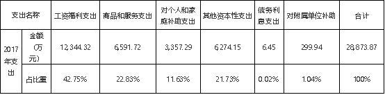 william威廉英国官网2017年度支出合计28,873.87万元。其中:基本支出18,337.01万元,占总支出的63.51%;项目支出10,236.93万元,占总支出的35.45%;对附属单位补助支出共299.94万元,占总支出的1.04%。支出结构见下表: