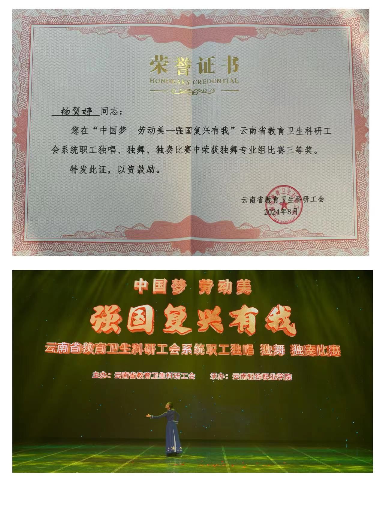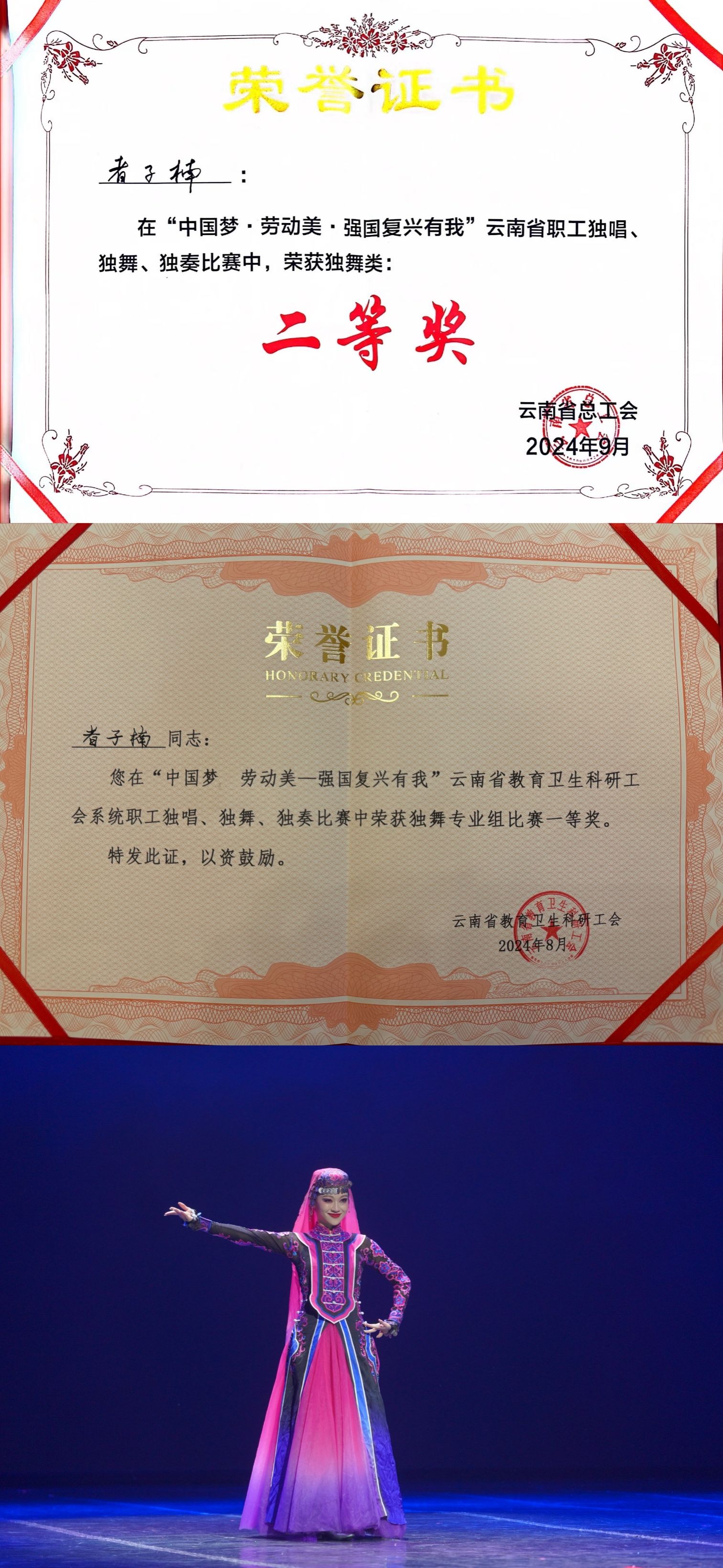 近日,云南省总工会以庆祝中华人民共和国成立75周年为重要契机开展系列活动,举办以“中国梦·劳动美·强国复兴有我”为主题的云南省职工独唱、独舞、独奏比赛。william威廉英国官网舞蹈学院青年教师者子楠和杨贺婷分别荣获云南省教育卫生科研工会举办的“三独”比赛专业组“一等奖”和“三等奖”(排名第一和第三)。最终,者子楠代表云南省教育卫生科研工会参加云南省总工会举办的“三独”比赛,荣获“二等奖”。