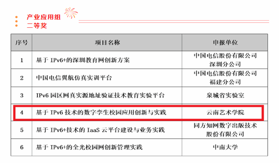 2024年11月9日,以“科教融合,创新发展”为主题,由推进IPv6规模部署和应用专家委员会指导,中国教育和科研计算机网CERNET网络中心主办,赛尔网络有限公司承办的第二届IPv6技术应用创新大赛科教赛道暨第七届下一代互联网技术创新大赛在北京“下一代互联网及重大应用技术创新园”落下帷幕。我校《基于IPv6技术的数字孪生校园应用创新与实践》项目荣获产业应用组二等奖。