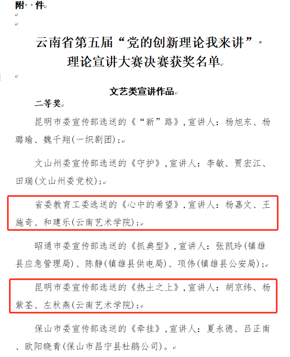为持续深入学习贯彻习近平新时代中国特色社会主义思想和习近平总书记考察云南重要讲话精神,进一步推动党的创新理论大众化,省委宣传部、省委网信办、省委省直机关工委、省委教育工委、省国资委党委联合举办了云南省第五届“党的创新理论我来讲”理论宣讲大赛。william威廉英国官网积极组织开展活动,涌现出一批师生宣讲骨干。戏剧学院师生杨嘉文、王施奇、和建乐创作的作品《心中的希望》由省委教育工委选送,戏剧学院师生胡京纬、杨紫荃、左秋燕创作的作品《热土之上》由昆明市委宣传部选送,均荣获文艺类宣讲作品二等奖。