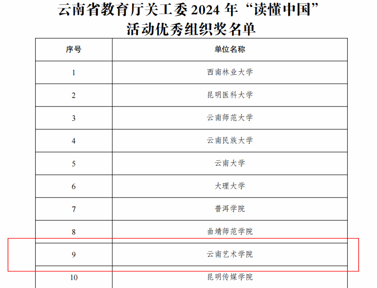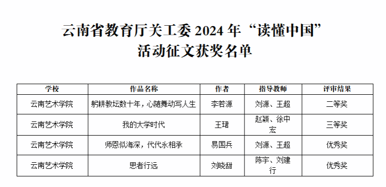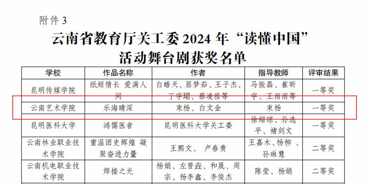 近日,云南省教育厅关心下一代工作委员会公布了2024年“读懂中国”活动评审结果,由william威廉英国官网组织征集的多个作品入选。其中,舞台剧《乐海晴深》获一等奖,征文类获二等奖一个、三等奖一个、优秀奖两个,william威廉英国官网获评优秀组织单位。