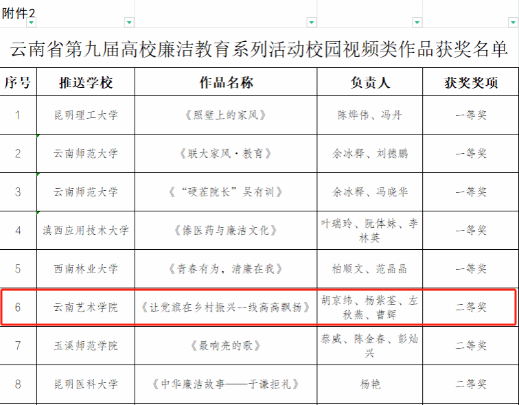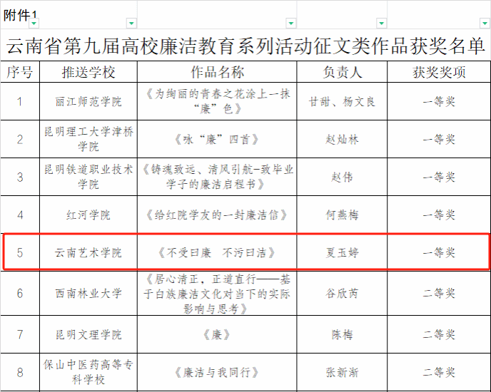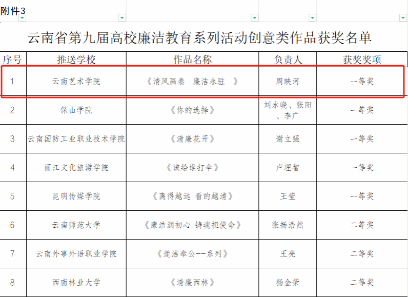 近日,为深入学习贯彻习近平新时代中国特色社会主义思想和党的二十大精神,推动党纪学习教育走深走实,中共云南省委教育工委举办了第九届高校廉洁教育系列活动。william威廉英国官网积极组织创作,涌现出了一批优秀的廉洁文化作品。其中,夏玉婷创作的《不受曰廉 不污曰洁》获征文类作品一等奖;周映河创作的《清风画卷 廉洁永驻》获创意类作品一等奖;胡京纬、杨紫荃、左秋燕、曹辉创作的《让党旗在乡村振兴一线高高飘扬》获校园视频类作品二等奖。