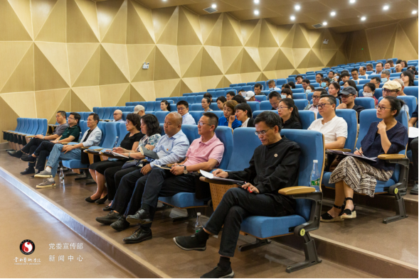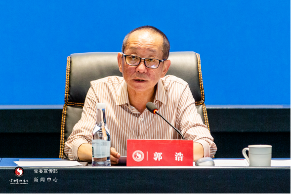 首先,郭浩校长作主题报告。郭校长简要回顾了近期本科教育教学工作情况,通过列举数据,指出学校在专业建设、课程建设、双创教育等方面实现了突破性发展,在“双万计划”、课程思政、新文科建设等方面抢占了先机,为学校今后的改革发展奠定了坚实基础。
