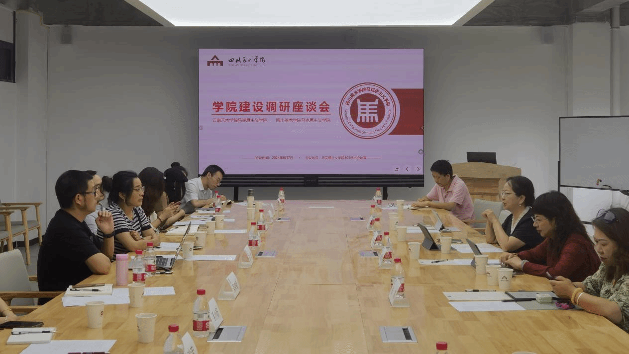 在调研座谈会上,四川美术学院马克思主义学院直属党支部书记王凤英首先以“艺术赋能乡村振兴——云南普洱老抓箐”为例,向与会人员介绍了川美马院在服务于乡村振兴中的具体做法。四川美术学院马克思主义学院院长陈斌从“室内”与“室外”两个维度,把思政课开到历史现场和艺术创作中,向与会人员详细介绍了“大思政”工作坊建设的经验与成效。在座谈会中,双方教师围绕“大思政课建设”“艺术院校思政课建设”“人才队伍培养”等方面进行交流与讨论。