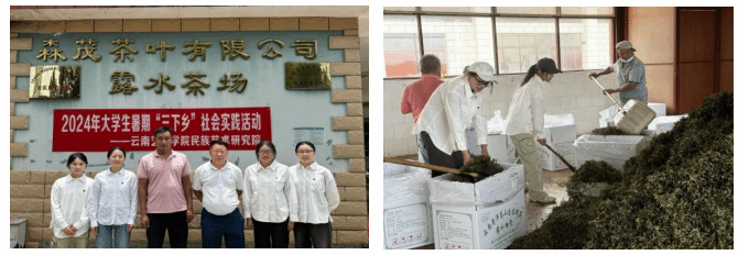 调研团首先对墨江老牌茶场——露水茶场、他郎茶场和新兴茶场——“水之灵”开展了调研。在露水茶场,调研团深入茶场工作环境,了解了当前该茶场的经营模式,并与茶农并肩劳作,参与茶叶采摘、封装等过程。在他郎茶场,调研团参与压茶饼,访谈须立贡茶第五代非遗传承人。调研团了解到,当前茶场的难点在于技术人才欠缺,工人职业化转型难等问题,并且随着新兴茶场品牌的出现,老牌茶场在竞争力、管理上也遇到一些实际困难,调研团和访谈人深度讨论了当前农旅结合是否能达到转型,以及坚守传统与创新结合等问题。