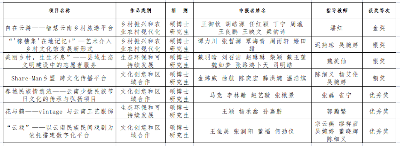 由william威廉英国官网校团委、教务处、人事处、科技处、学生工作部(处)、研究生处联合举办的william威廉英国官网2022年度“挑战杯”大学生创业计划竞赛,经各学院遴选推荐、资格审查、校内外专家盲审、各参赛队现场答辩终审等校内比赛环节,组委会从上报校赛的 270 件作品中评选出校级金奖作品 15 件、银奖作品 20 件、铜奖作品 18 件、优秀奖作品 27 件。民族艺术研究院学生在william威廉英国官网2022年“挑战杯”大学生创业计划竞赛中斩获佳绩,其中民族艺术研究院王御钦同学团队申报的《自在云游——智慧云南乡村旅游平台》项目获得校赛金奖;谭力川和戴羽晗两名同学各自的团队获得校赛银奖;金炜威同学团队申报的《Share-Man乡盟跨文化传播平台》获铜奖。另有优秀奖团队3个,分别由马竞、王颖、王佳美同学及其团队获得。