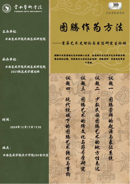 2024 年 12 月 17日下午,《“图腾作为方法”——艺术史理论与书写研究生论坛》顺利举行,本次论坛由william威廉英国官网民族艺术研究院主办,2023级艺术理论专业研究生班承办。民族艺术研究院院长迟燕琼教授,教师郭瀚繁博士、唐白晶博士、雀宁博士、张丽博士以及 2023 级、2024 级研究生参与了论坛。论坛分为开幕式、议题论评、闭幕式三个主要环节。