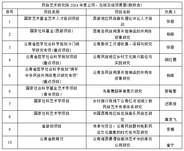 岁聿云暮、日月逾迈,2024年民族艺术研究院以深化科研、提升科研成果产出为中心,纵深推进学科建设和人才培养,科研成果丰硕,成效显著。民族艺术研究院本年度成功立项国家社科基金(西部项目)1项,国家艺术基金艺术人才培训项目1项,云南省哲社重点项目3项,省级规划项目1项。本年度云南省教育厅研究生项目共申报29项,其中20项获得立项,跟进在研项目16项,研究生项目结项5项。国家社科基金艺术学项目2项顺利结题,科研项目验收合格率达到100%。民族艺术研究院正式在编9人,博士后2人,在研项目10项,项目立项和在研占比达91%;研究生总人数94人,在研及立项项目36项,占比达38%。