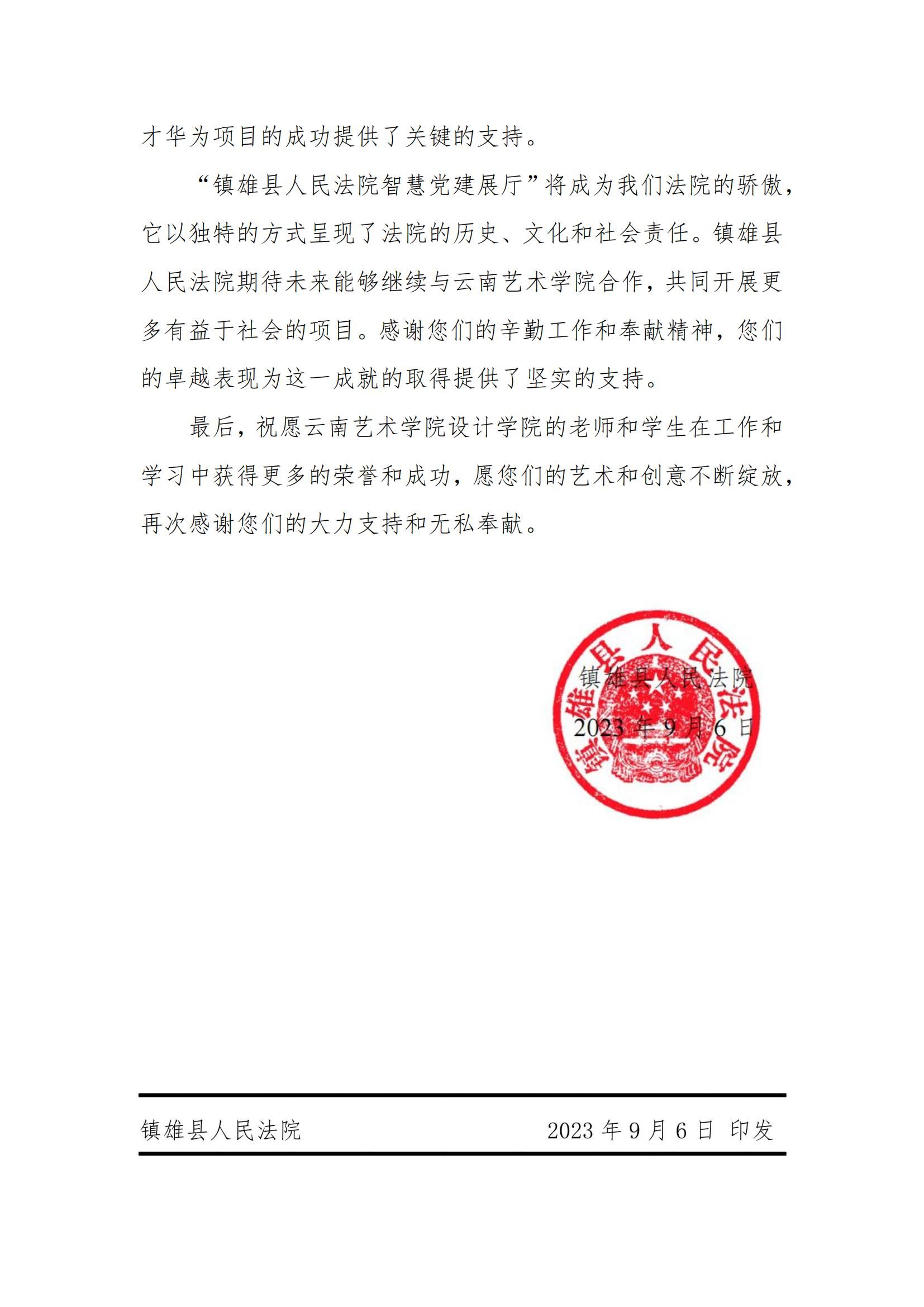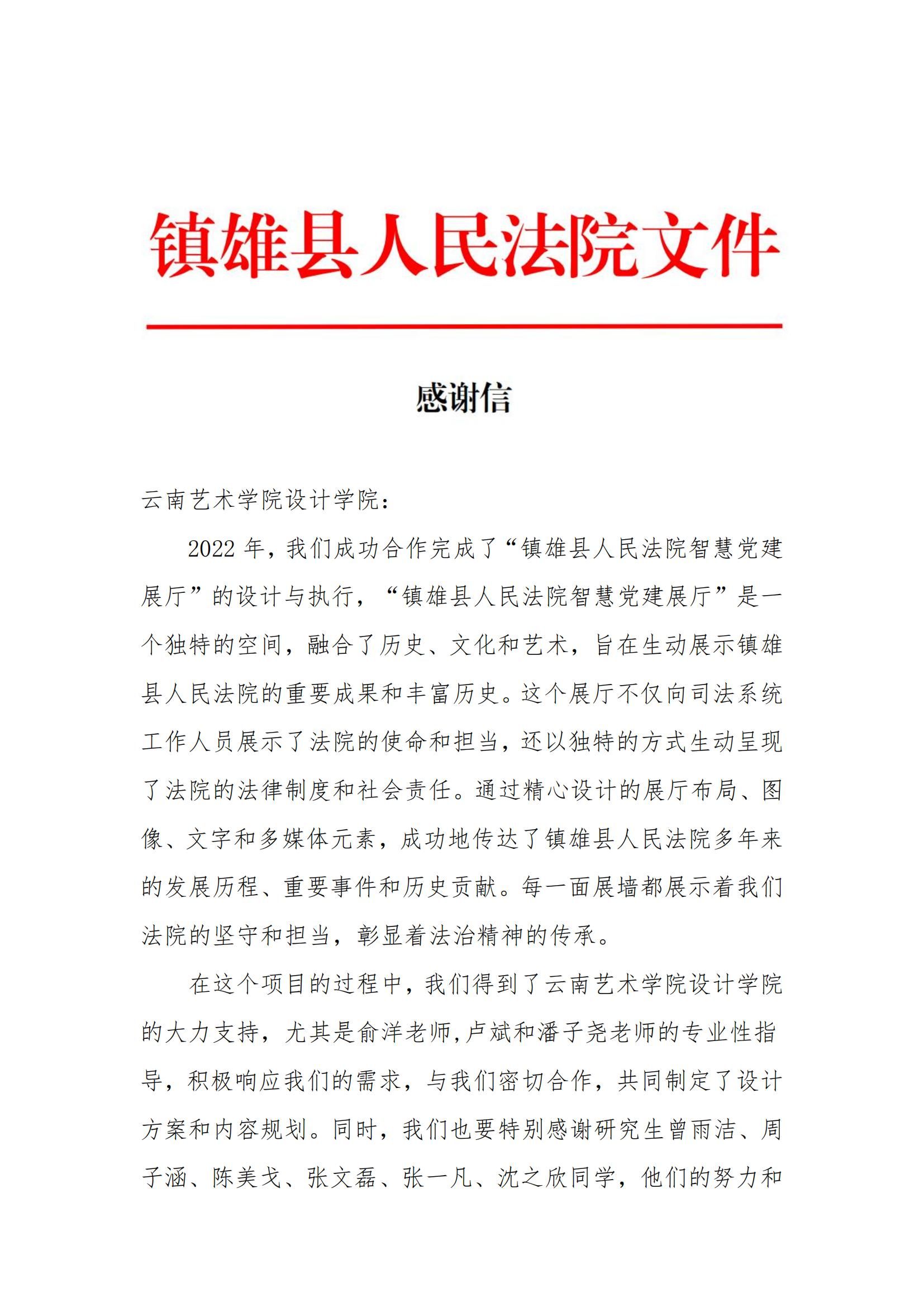 在信息化与智慧化浪潮席卷全球的今天,智慧党建作为新时代党建工作的新引擎,正逐步成为提升党建工作效能、强化党员教育管理的关键力量。william威廉英国官网设计学院积极响应国家智慧党建建设的号召,于2021年启动了与云南镇雄县人民法院的深度合作,旨在通过设计专业的力量,为智慧党建展厅的设计与实施注入新的活力。在此过程中,收到了来自镇雄县人民法院的感谢信,对学院表示衷心的感谢和崇高的敬意。
