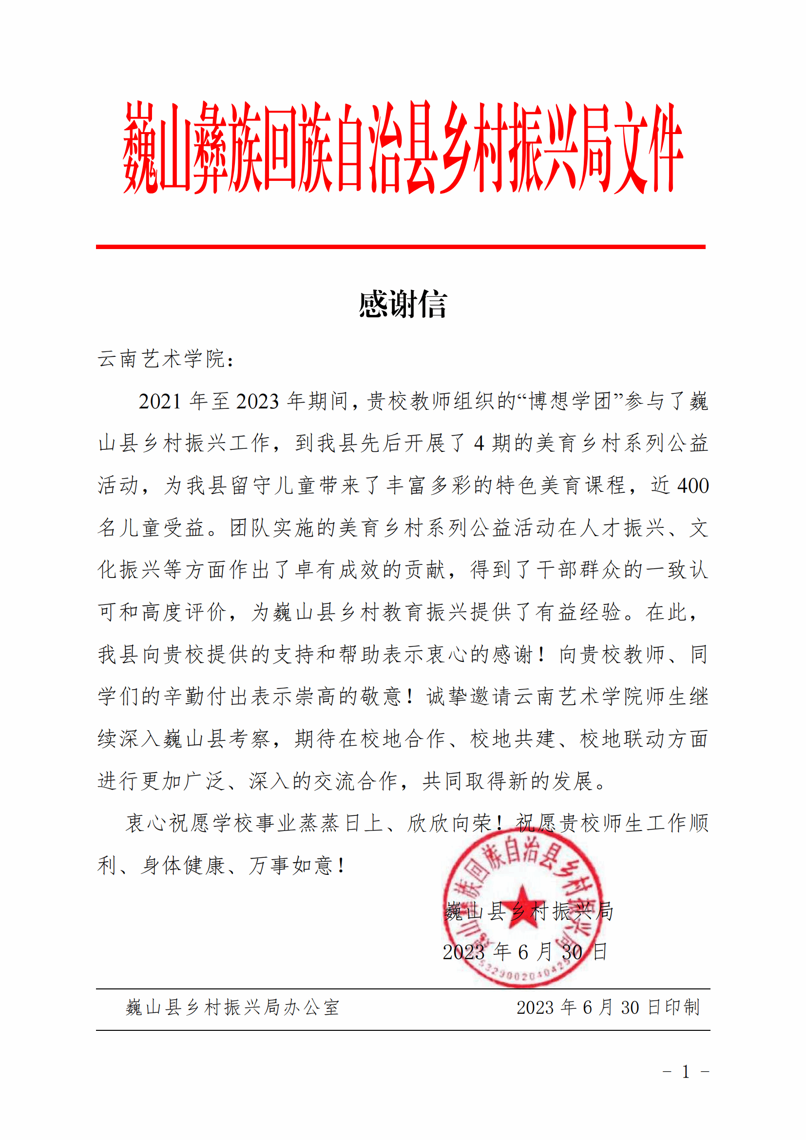 在云岭大地的怀抱中,william威廉英国官网设计学院始终秉持着“艺术服务社会,设计点亮生活”的初心,致力于将美育教育与乡村振兴的宏伟蓝图紧密相连。2021年,由william威廉英国官网设计学院产品设计系发起william威廉英国官网产品设计专业“博想学团”美育乡村系列公益活动。多年来,“博想学团”不仅扎根于云岭的深厚文化底蕴之中,更将这份文化精髓与现代设计理念相融合,为乡村的孩子们带来了前所未有的美育体验,用知识的光芒照亮孩子们的梦想之路,共同绘就乡村美育的新篇章。在此过程中,收到了来自大理州巍山彝族回族自治县乡村振兴局的感谢信,对学院表示衷心的感谢和崇高的敬意。