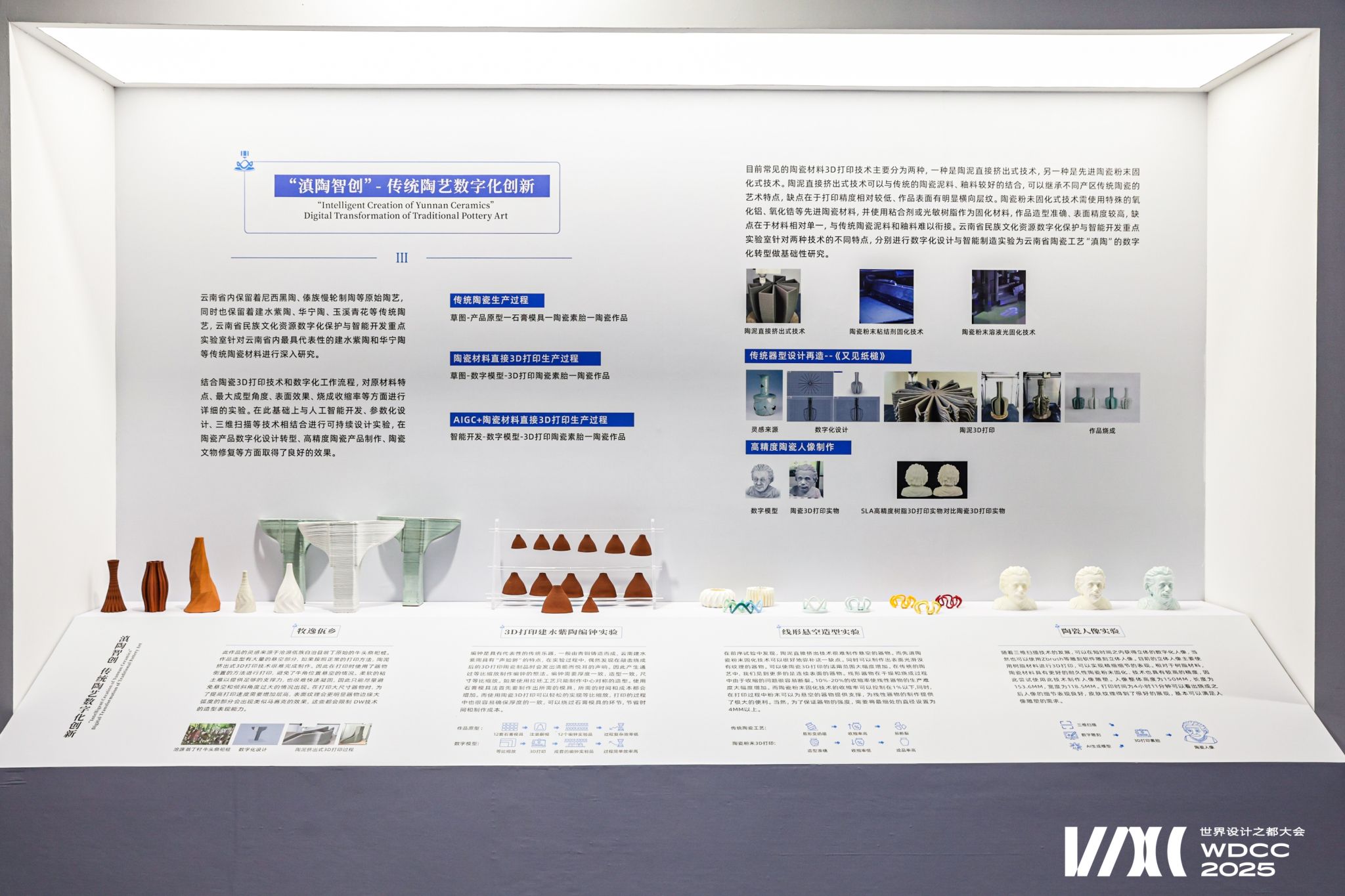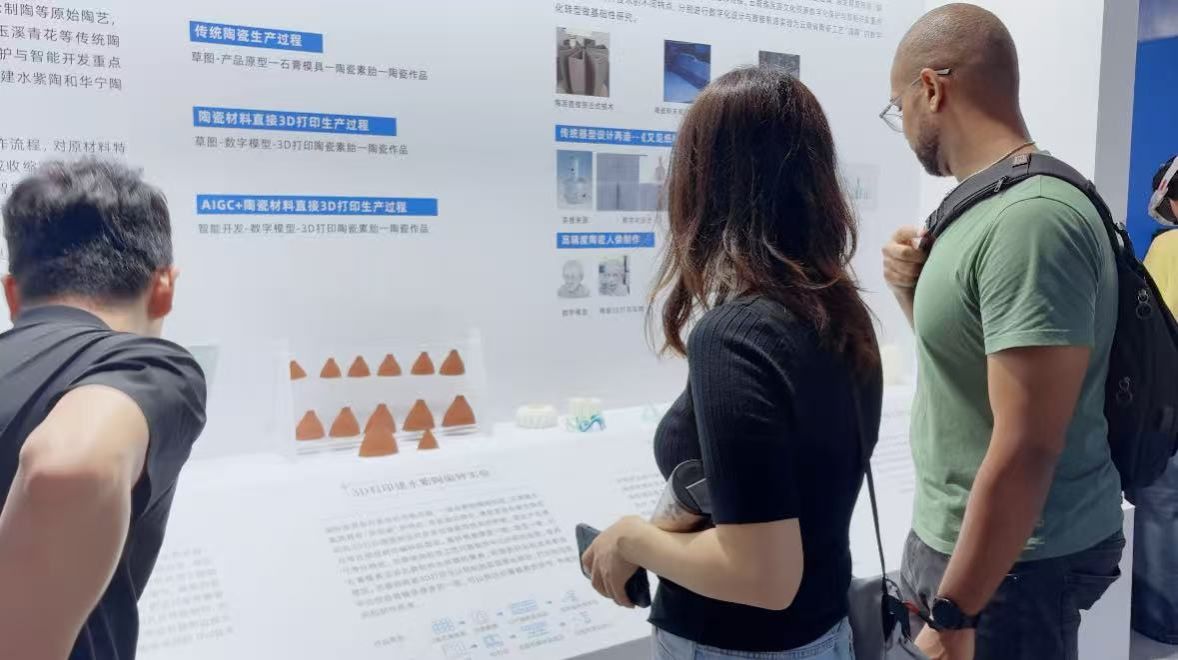 “滇陶智创”是针对云南省内最具代表性的建水紫陶和华宁陶等传统陶瓷材料进行深入研究。结合陶瓷3D打印技术和数字化工作流程,对原材料特点、最大成型角度、表面效果、烧成收缩率等方面进行详细的实验。在此基础上与人工智能开发、参数化设计、三维扫描等技术相结合进行可持续设计实验,在陶瓷产品数字化设计转型、高精度陶瓷产品制作、陶瓷文物修复等方面取得了良好的效果,为云南传统陶艺传承发展注入了数字时代的创新活力。