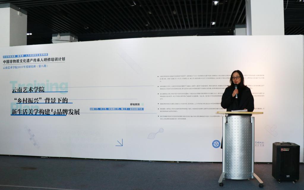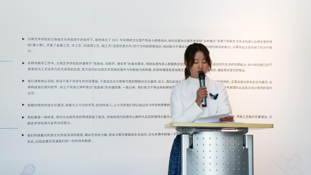 此次非遗研培学员代表尹丽、杨志瑞发表了自己的培训感想,她们以真切的个人感受、富含激情的话语将培训过程中点点滴滴的心路历程向与会人员作了分享,表示经过此次培训交流,不仅从专业的领域更加深刻具体地了解非遗的概念,也看到手工艺助推乡村振兴的能量,了解到时尚设计与乡土文化可以相互赋能,今后将更加坚定成为一名传承人的决心,现场不时传来阵阵鼓励与赞赏的掌声。