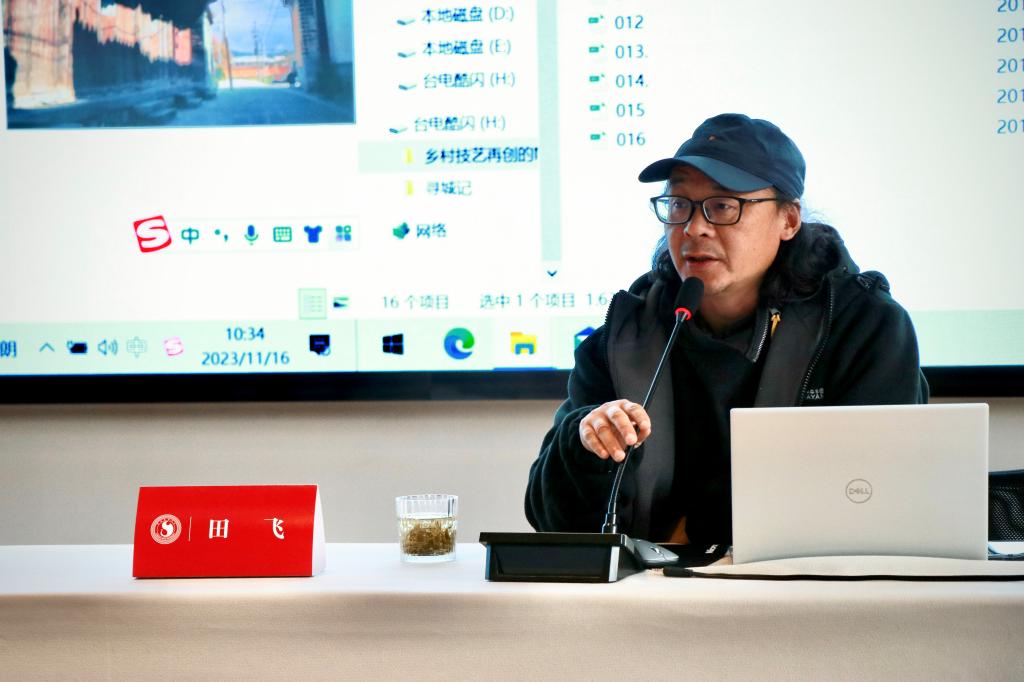 田飞老师在讲座中分享了他在云南大理喜洲这十余年的时间里对当地手工艺文化、乡土民族艺术、乡土人文的研究,并为学员们介绍了甲马版画艺术馆、民艺中心百工馆和喜洲老街中的艺术装置的设计思路和过程。田飞老师以有趣的案例来告诉学员们乡村非遗技艺再创的多种可能性,并激发他们进一步探索这一领域的兴趣。
