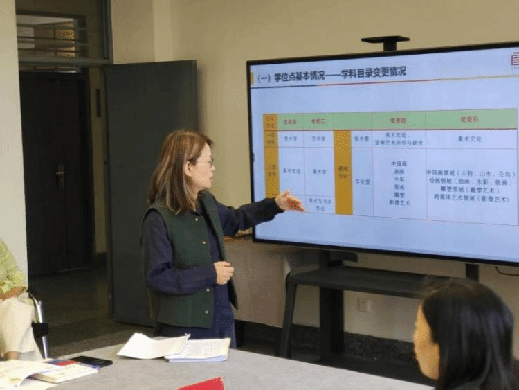 曹悦院长对标第五轮学科评估指标、全国专业水平评估指标,就美术学院学科建设现状进行了细致的分析。同时,曹悦院长对标申博基本条件的专业领域设置版块、师资队伍建设版块、人才培养版块、培养环境与条件版块进行对标分析,指明不足。明确下一步工作需要精准补齐短板,强化特色优势,推进申博工作的各项指标达到最优状态。