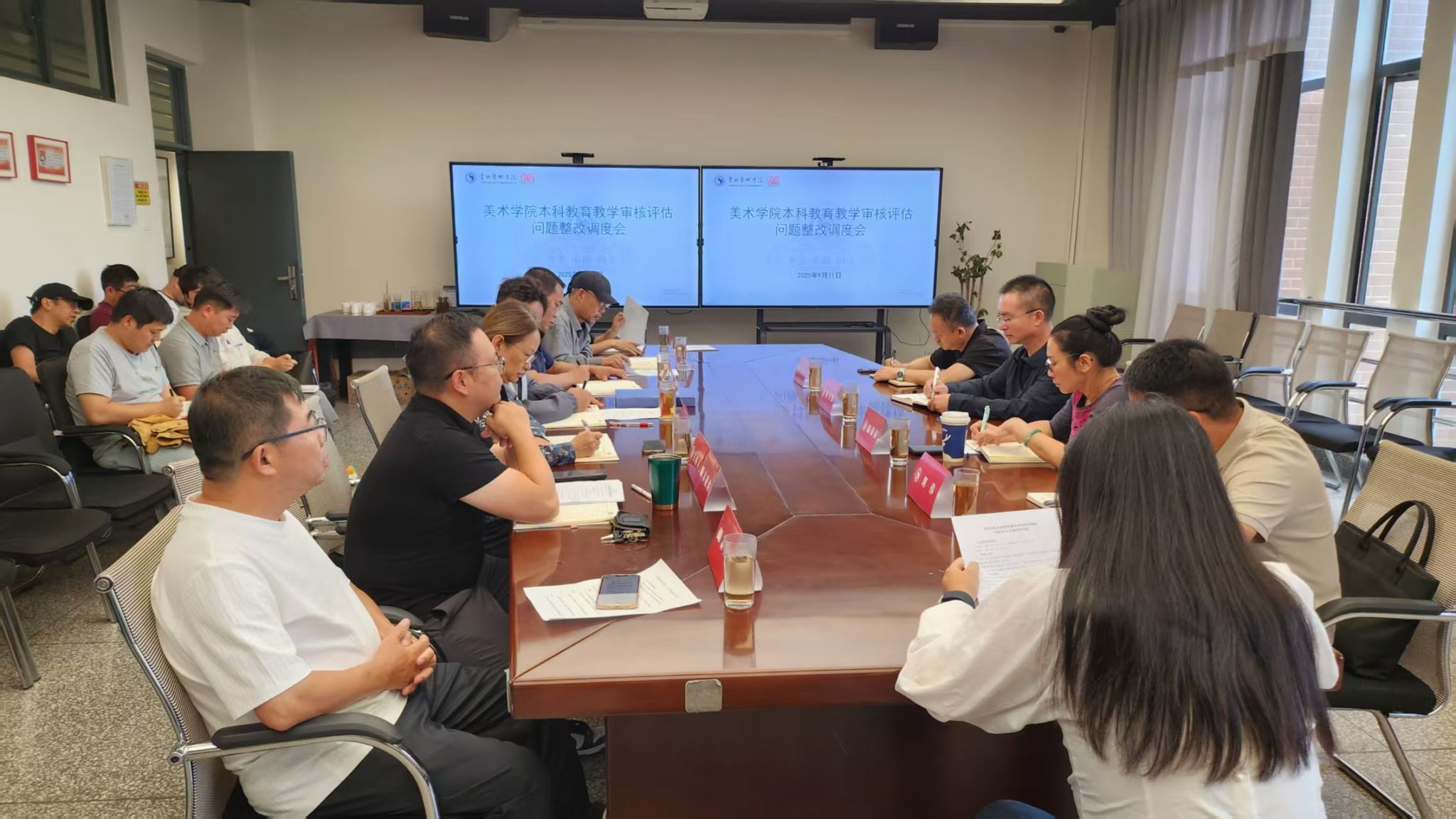 2025年9月11日美术学院本科教育教学审核评估问题整改调度会如期召开。校审核评估整改工作督察监督组组长、校纪委书记、监察专员杨军伟,校审核评估整改工作办公室温泉沁处长,校教育教学质量保障中心副主任李卫兵,校纪检监察处纪检监察室副主任刘伟,美术学院党政班子领导、各系部主任、专业负责人、行政科室负责人参会,会议由沐晓熔副院长主持。通过定期盘点整改进度,核查整改成效,确保整改工作的持续性与有效性,彰显学院对本科教育教学审核评估问题整改工作的高度重视与坚定决心。